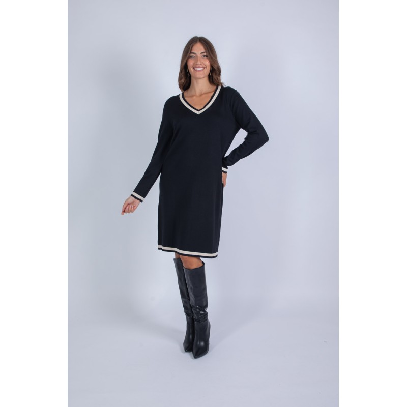 Dai una svolta sofisticata ai tuoi look quotidiani con questo elegante abito in maglia. Caratterizzato da un raffinato scollo a V che slancia la figura, è impreziosito da profili a coste a contrasto che donano un tocco grafico e moderno. La vestibilità morbida valorizza le forme con naturalezza, offrendo al tempo stesso comfort e libertà di movimento. Un capo versatile che si adatta perfettamente sia a look casual con stivaletti che a mise più chic con tacchi e accessori luminosi. Aggiungilo subito al tuo guardaroba e lasciati conquistare dal mix perfetto di praticità e stile senza tempo. 70% viscosa 20% lana 10% elastan