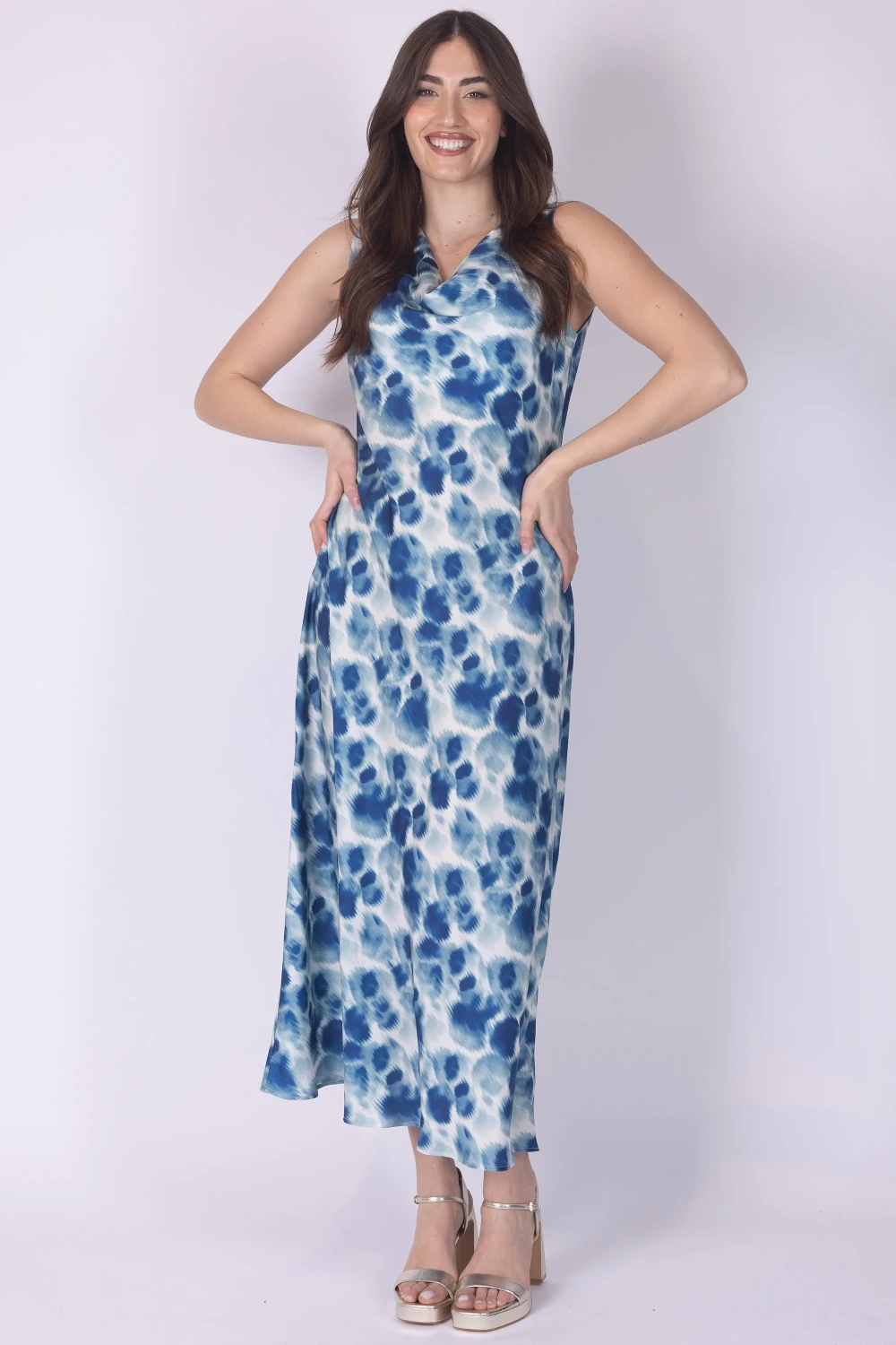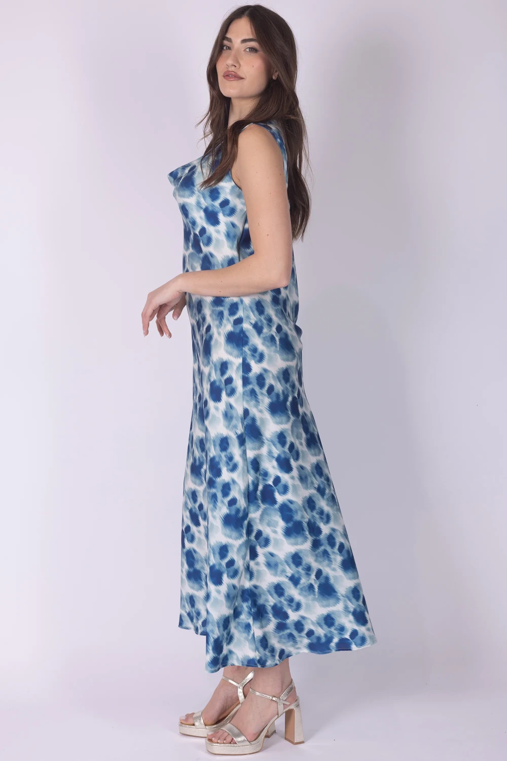 Abito giromanica fantasia con scollo cloche, caratterizzato da una linea morbida che valorizza il movimento del tessuto. La stampa dona al capo un aspetto vivace e ricco di personalità.