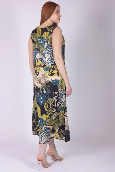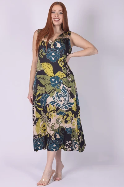 Abito giromanica in seta fantasia jungle, caratterizzato da scollo a V che valorizza la linea del capo. La stampa ispirata alla natura dona al modello un aspetto vivace e ricco di personalità.