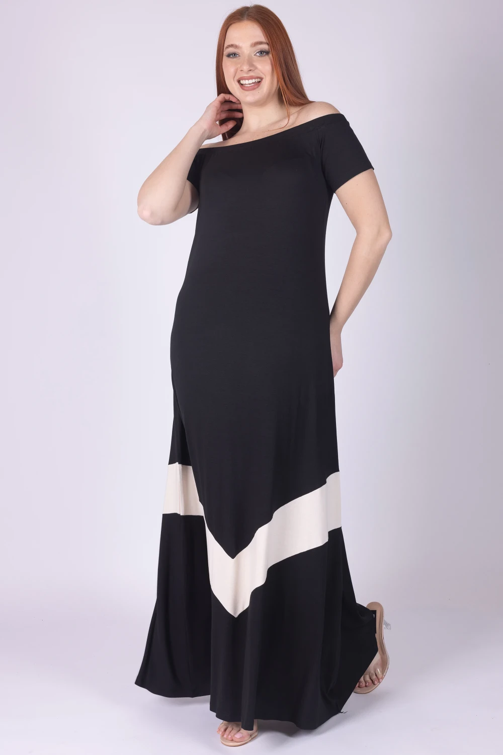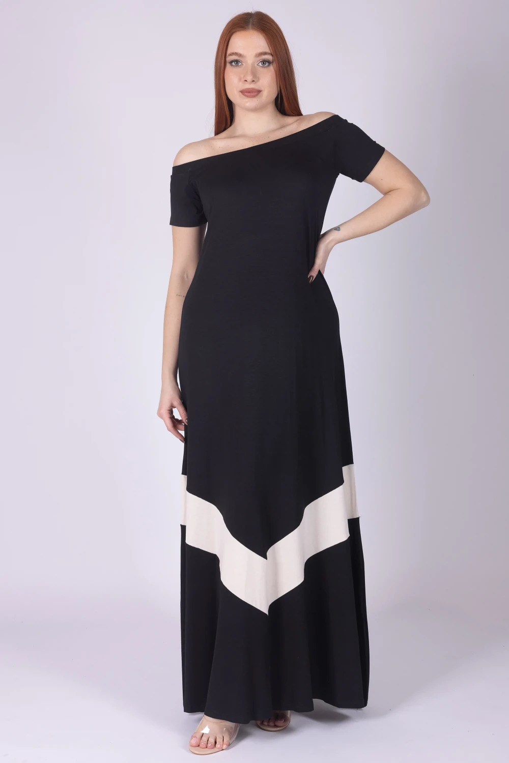 Abito con scollo chiffer, caratterizzato da motivo geometrico bicolore che dona al capo un effetto grafico moderno e originale.
