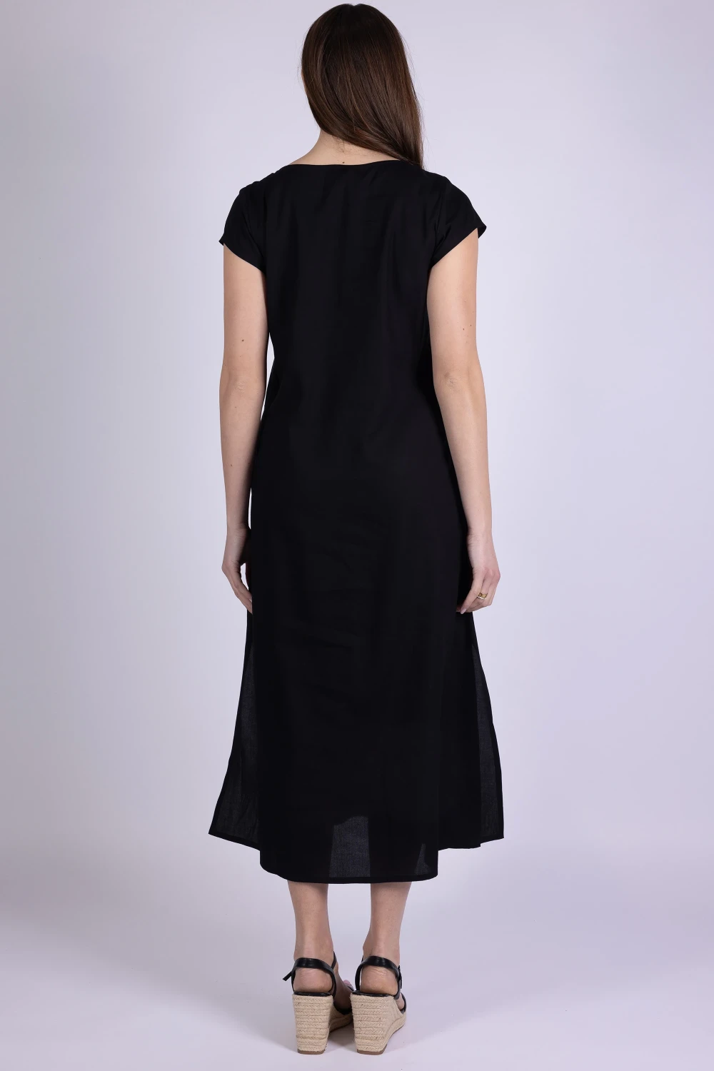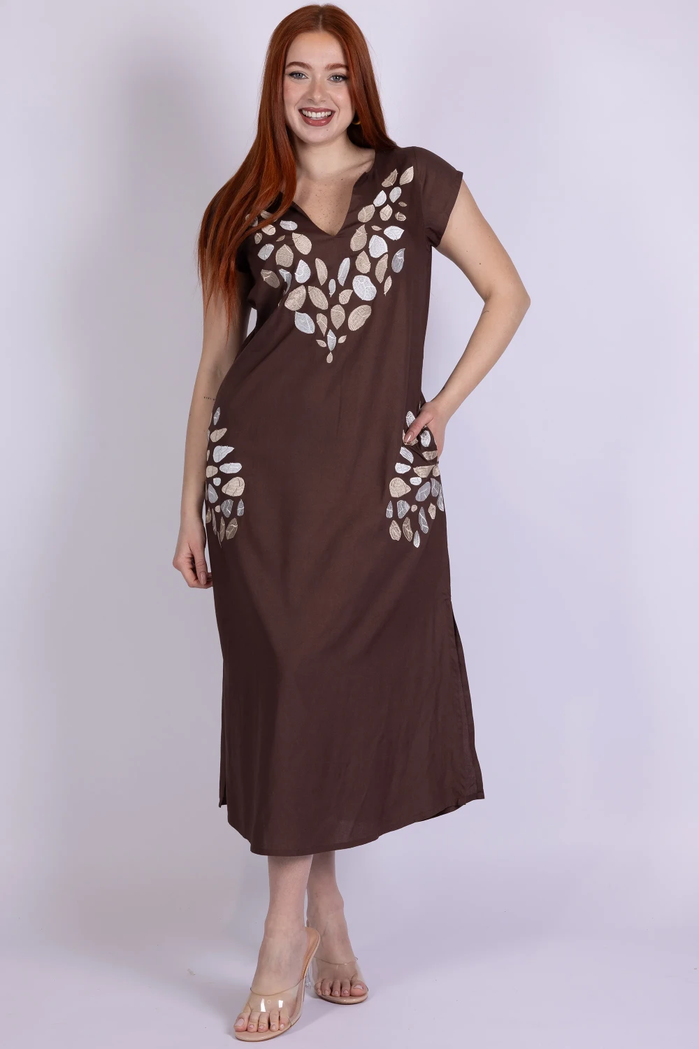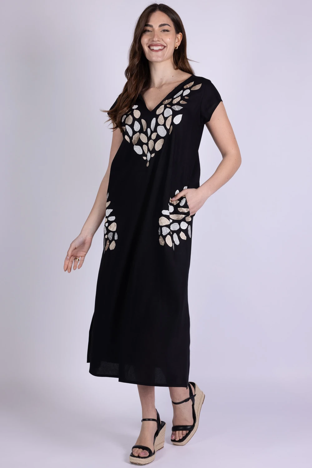 Dai carattere ai tuoi abbinamenti con questo abito con scollo a V, un capo leggero e ricco di dettagli pensato per distinguersi con semplicità. Il modello è arricchito da ricami etnici su scollo e tasche, elementi decorativi che donano personalità e un tocco originale al design.