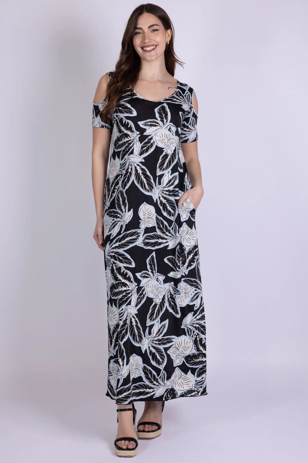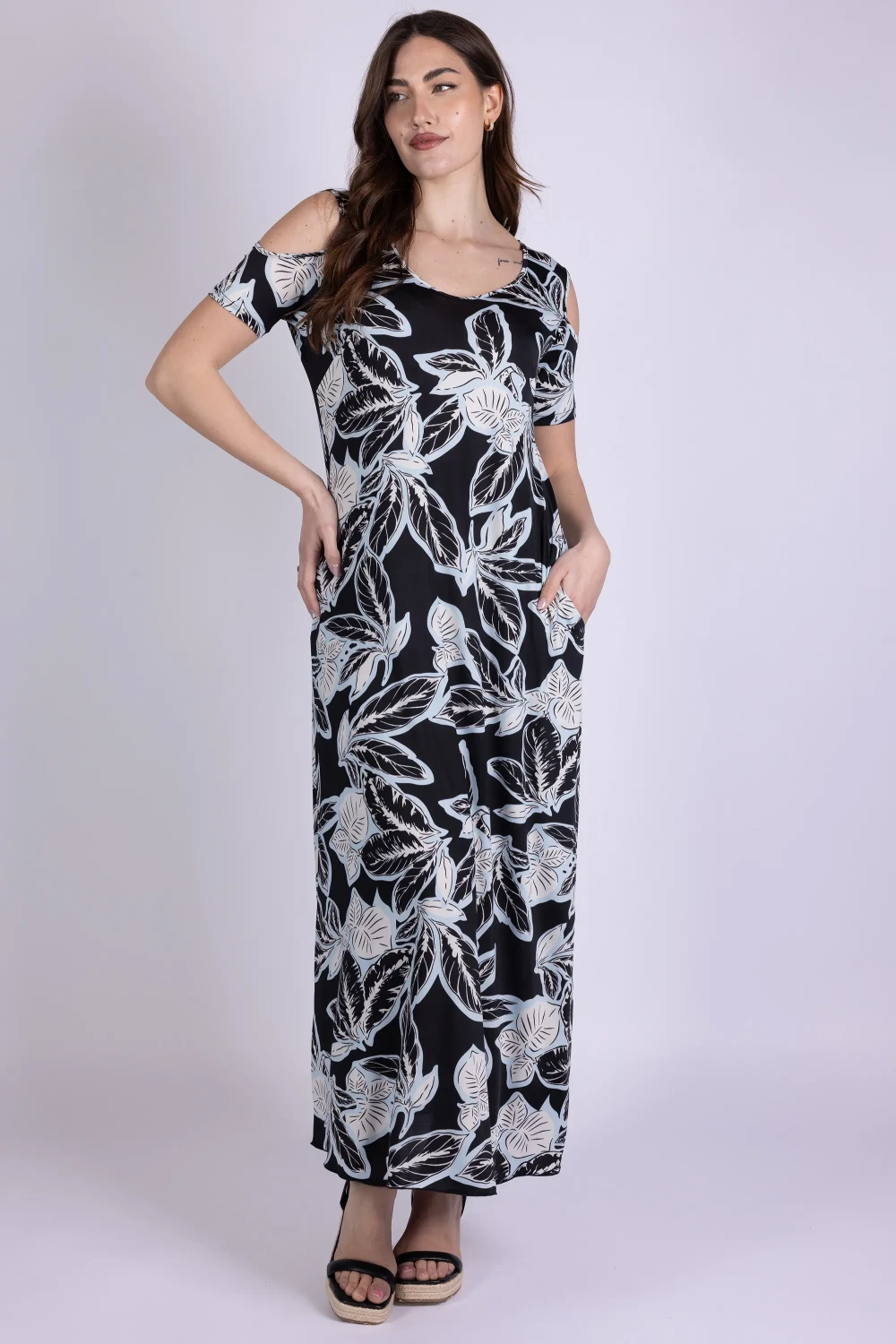 Il tessuto morbido accompagna la linea del corpo con naturalezza, mentre la stampa aggiunge movimento al design del modello.