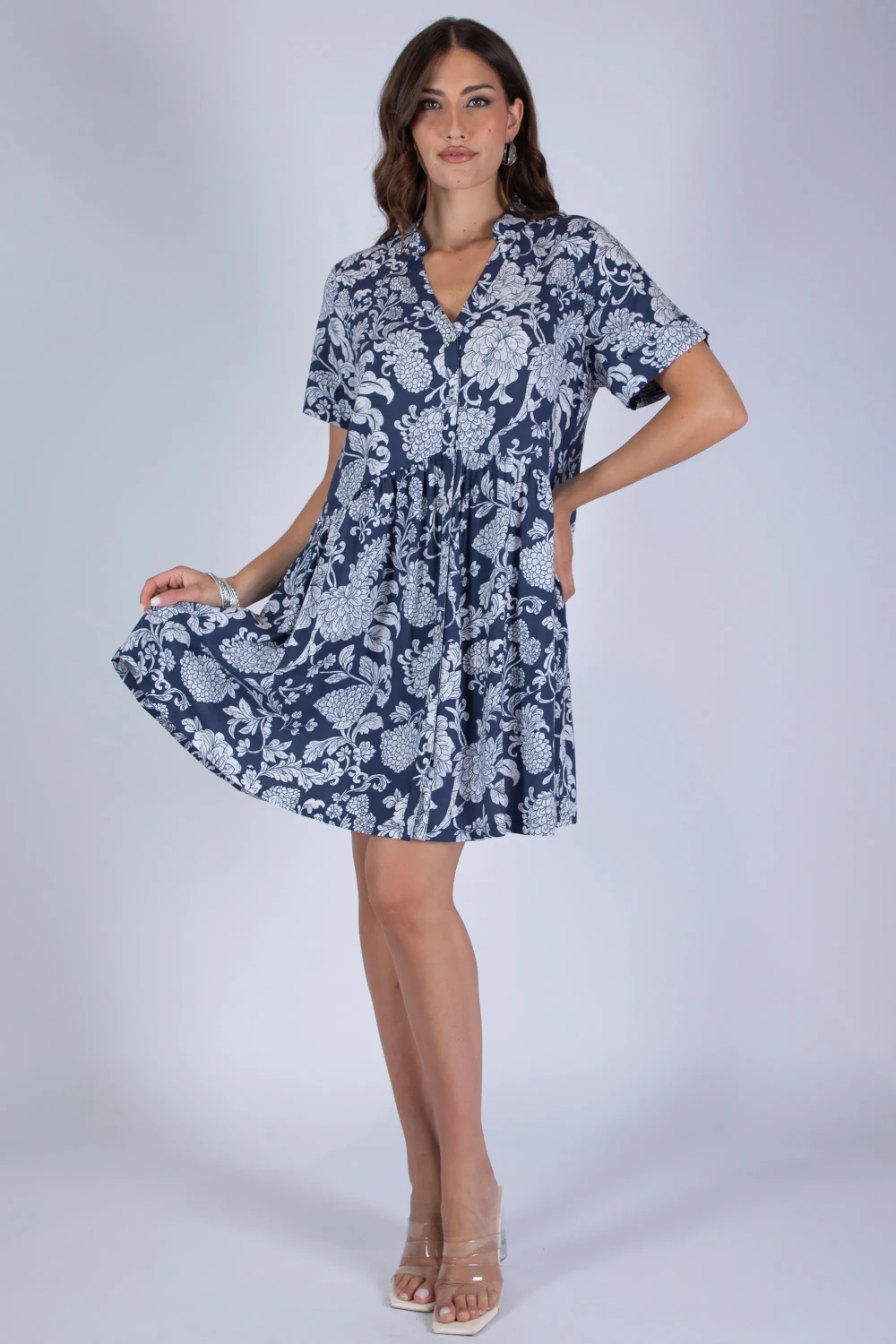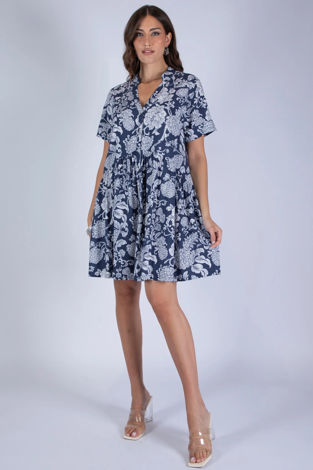 Abito in modal fantasia modello chemisier, ispirato alla classica linea camicia reinterpretata in chiave femminile. La stampa valorizza il tessuto leggero, donando al capo un aspetto vivace e ricco di personalità.