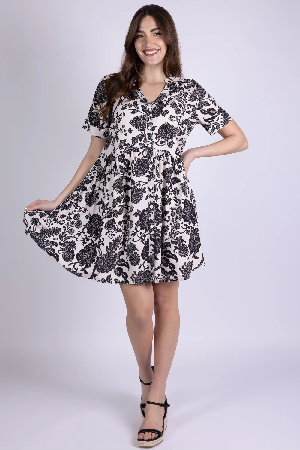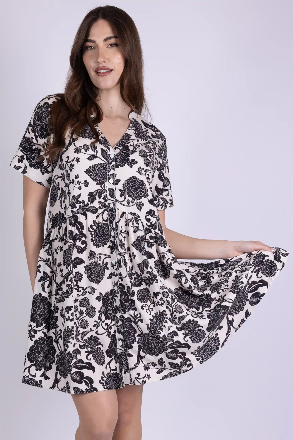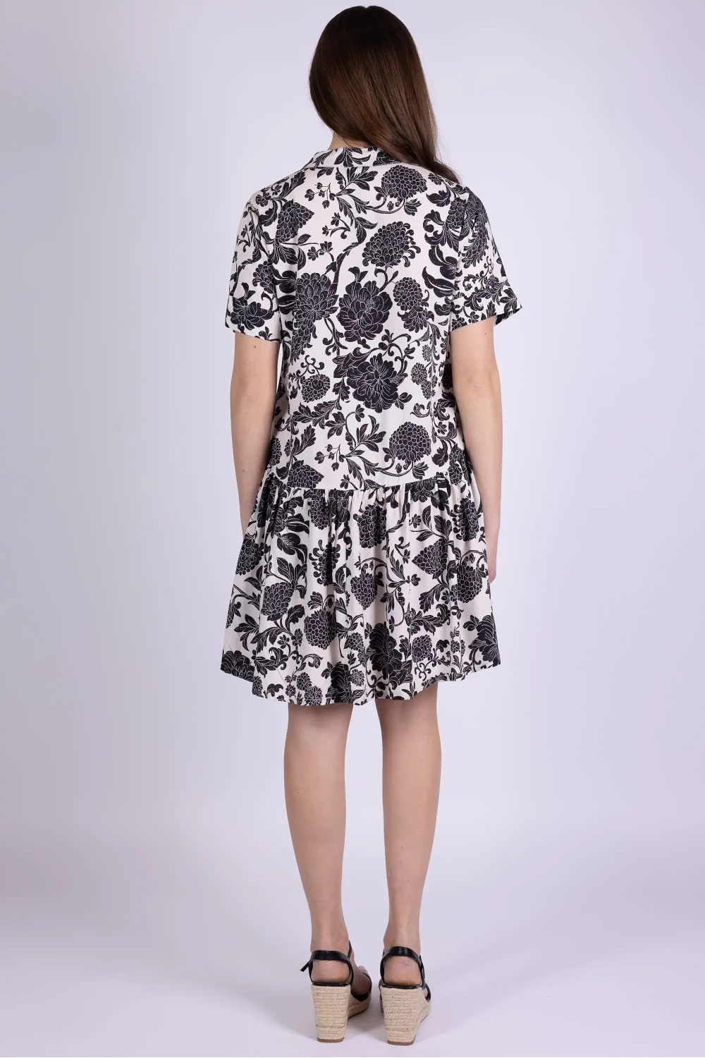 Abito in modal fantasia modello chemisier, ispirato alla classica linea camicia reinterpretata in chiave femminile. La stampa valorizza il tessuto leggero, donando al capo un aspetto vivace e ricco di personalità.
