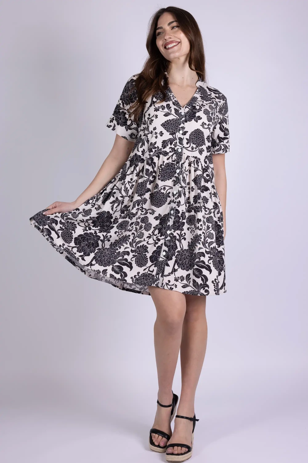 Abito in modal fantasia modello chemisier, ispirato alla classica linea camicia reinterpretata in chiave femminile. La stampa valorizza il tessuto leggero, donando al capo un aspetto vivace e ricco di personalità.