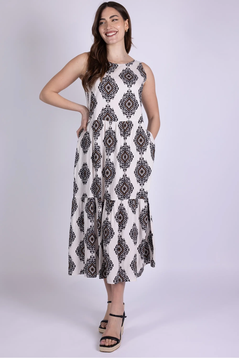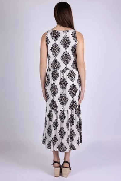 Abito giromanica in modal caratterizzato da fantasia etnica che dona al capo un aspetto ricco di personalità. Il design essenziale valorizza la stampa, mettendo in risalto il motivo decorativo.