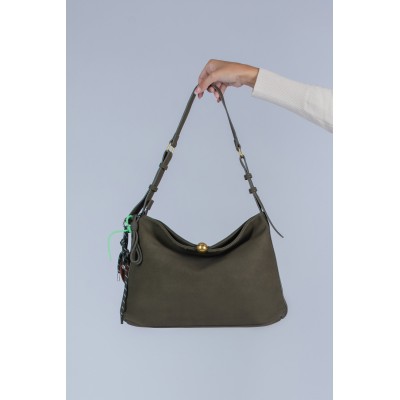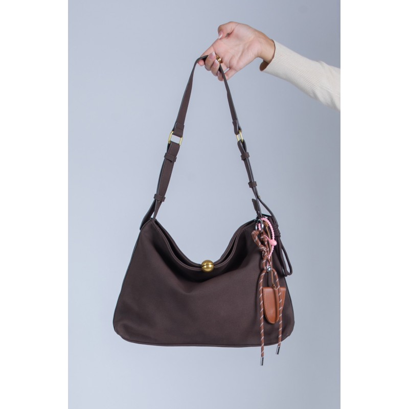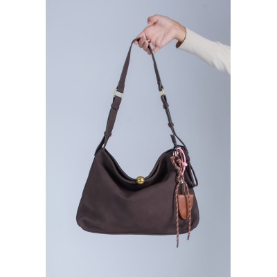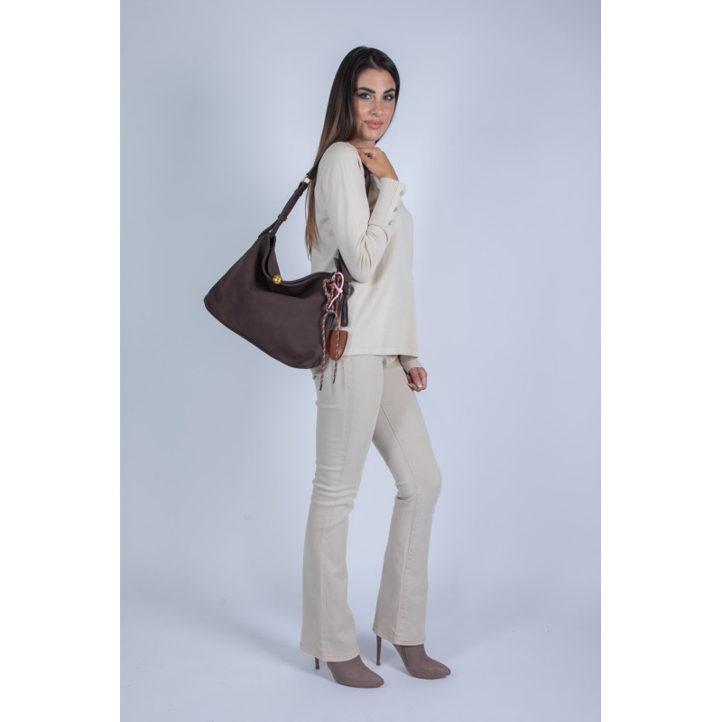 Dotata di tracolla regolabile, può essere indossata comodamente a spalla o a mano, adattandosi con naturalezza alle diverse occasioni della giornata. Il dettaglio dei charm laterali con nappine e intrecci colorati dona alla borsa un carattere distintivo e un pizzico di originalità.