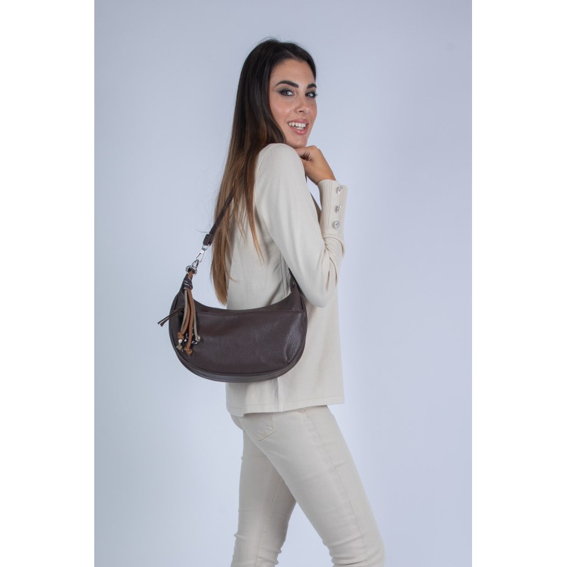 Realizzata in eco-pelle martellata di qualità, è impreziosita da una nappina laterale che aggiunge un tocco contemporaneo e femminile. Lo scomparto principale con chiusura a zip garantisce sicurezza e ordine.