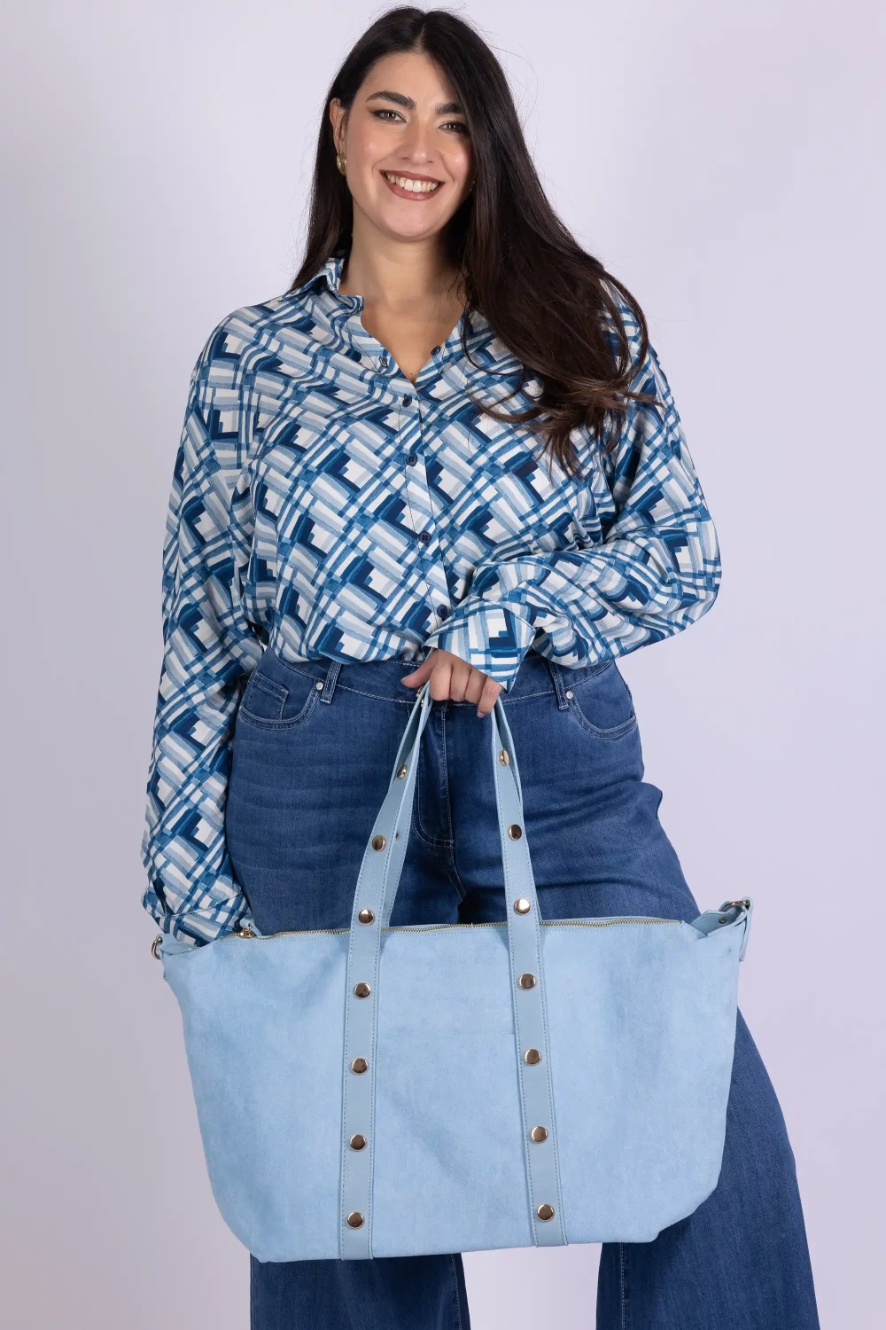 Texture morbida e design ricercato definiscono questa borsa scamosciata, un accessorio capiente e di carattere perfetto per accompagnare i tuoi abbinamenti quotidiani. La superficie effetto suede dona un aspetto caldo e materico, mentre i dettagli con borchie metalliche aggiungono un tocco deciso e contemporaneo. La doppia portabilità con manici e tracolla la rende pratica e versatile, ideale per affrontare la giornata con stile senza rinunciare alla funzionalità. Lâampio spazio interno permette di organizzare comodamente tutto il necessario. Perfetta da abbinare a look casual o più curati, per completare ogni outfit con personalità. Portala con te e dai carattere ai tuoi abbinamenti fin dal primo sguardo. Materiale: 100% ecopelle effetto scamosciato