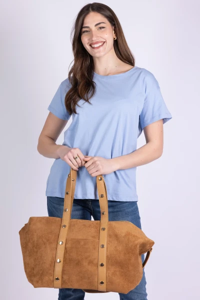 Texture morbida e design ricercato definiscono questa borsa scamosciata, un accessorio capiente e di carattere perfetto per accompagnare i tuoi abbinamenti quotidiani. La superficie effetto suede dona un aspetto caldo e materico, mentre i dettagli con borchie metalliche aggiungono un tocco deciso e contemporaneo.