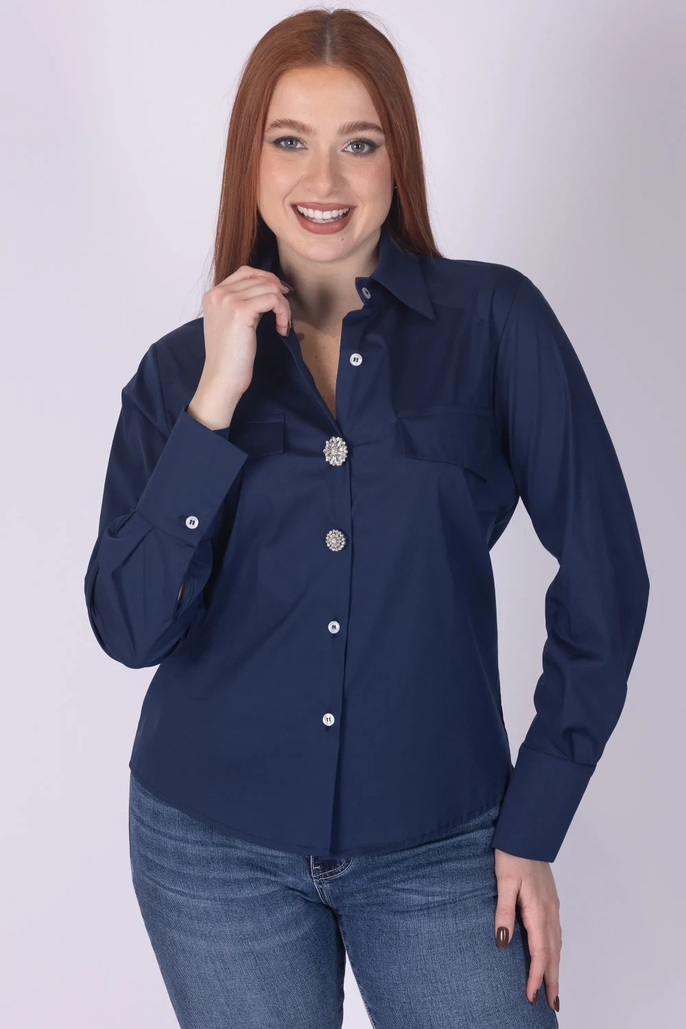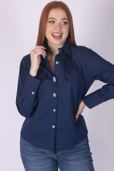 Camicia con chiusura frontale con bottoni, impreziosita da due bottoni gioiello removibili che donano al capo un dettaglio luminoso e originale. Il modello è completato da due tasche frontali, elementi che aggiungono carattere al design.