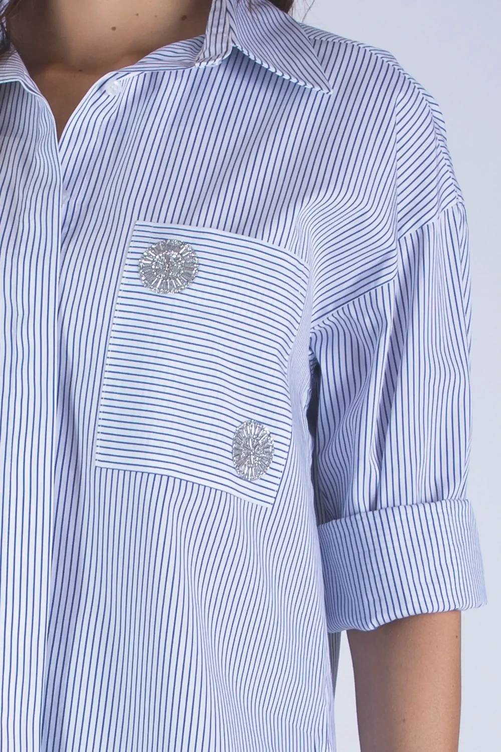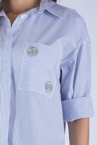 Camicia fantasia a bastoncino realizzata in cotone, arricchita da applicazioni di strass sulla tasca, dettaglio luminoso che dona al capo un tocco originale.