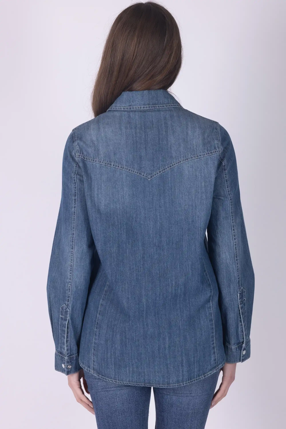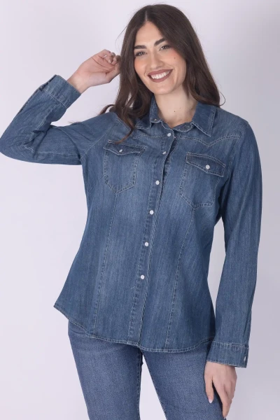 Camicia in jeans dal design pulito e contemporaneo, pensata per aggiungere un tocco casual al guardaroba. Il modello è caratterizzato da chiusura frontale con ciappe in madreperla, dettagli luminosi che donano al capo un accento raffinato.