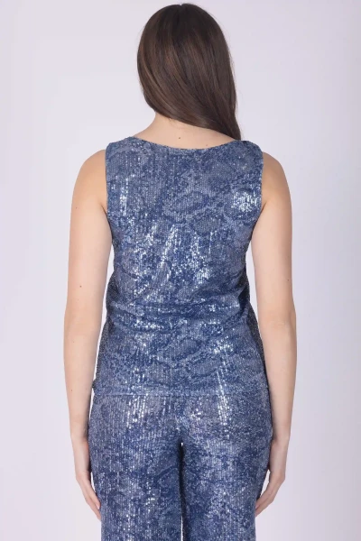 Top scollo a V in paillettes fantasia, caratterizzato da un design che cattura lo sguardo grazie al gioco decorativo delle paillettes. Il modello presenta elastico che assicura una vestibilità confortevole.