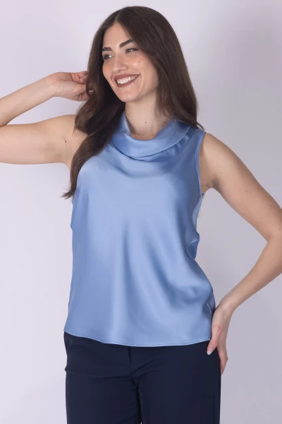 Top in raso con scollo clochet, caratterizzato da una linea morbida che valorizza la fluidità del tessuto. La finitura satinata dona al capo un effetto luminoso, rendendolo elegante e piacevole da indossare.