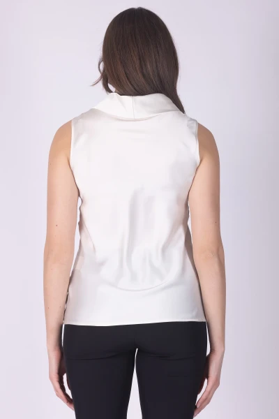 Top in raso con scollo clochet, caratterizzato da una linea morbida che valorizza la fluidità del tessuto. La finitura satinata dona al capo un effetto luminoso, rendendolo elegante e piacevole da indossare.
