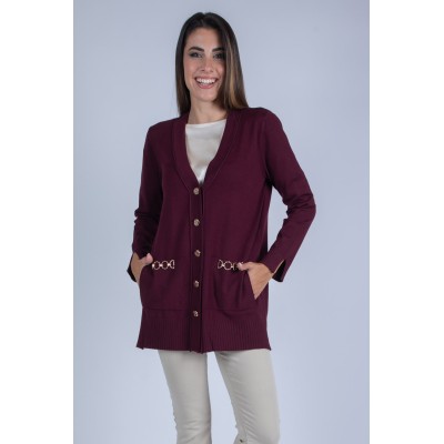Cardigan con abbottonatura frontale e tasche, impreziosito da raffinati accessori in metallo che donano un tocco di eleganza e personalità. Morbido e avvolgente, è la scelta perfetta per arricchire i tuoi outfit con stile e funzionalità. Aggiungilo subito al tuo guardaroba e vivi il comfort senza rinunciare al design! 70% viscosa 20% lana 10% elastan