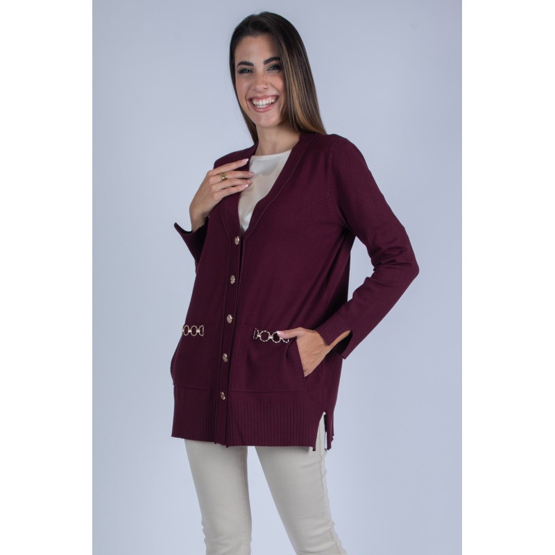 Cardigan con abbottonatura frontale e tasche, impreziosito da raffinati accessori in metallo che donano un tocco di eleganza e personalità. Morbido e avvolgente, è la scelta perfetta per arricchire i tuoi outfit con stile e funzionalità. Aggiungilo subito al tuo guardaroba e vivi il comfort senza rinunciare al design! 70% viscosa 20% lana 10% elastan