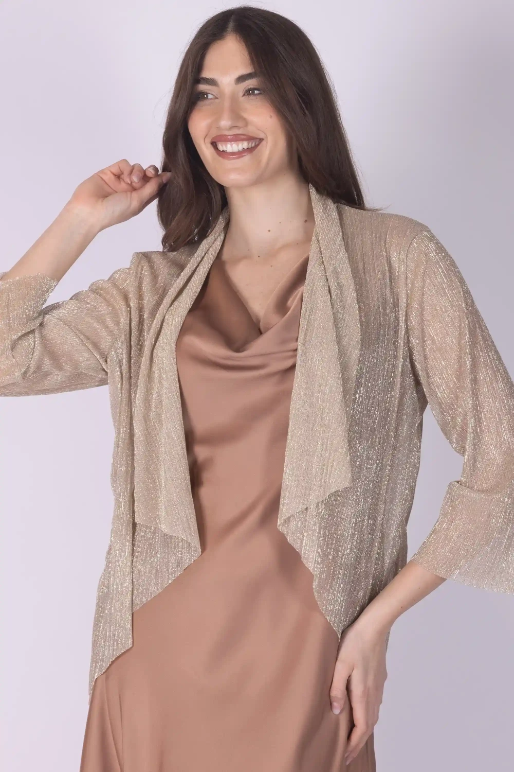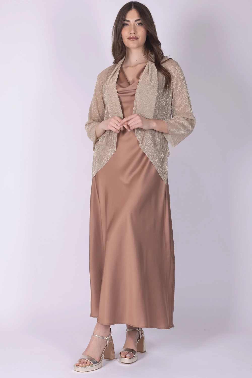 Il design leggero valorizza la fluidità del tessuto, rendendolo perfetto per completare abiti eleganti o outfit da occasione speciale con un tocco luminoso.