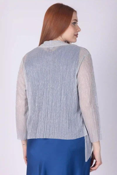Coprispalle laminato in tessuto plissettato semitrasparente, caratterizzato da una lavorazione che crea un raffinato effetto di movimento e riflessi di luce.