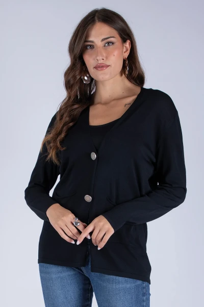 Cardigan in maglia dal carattere essenziale, arricchito da tasche con taglio vivo che donano al capo un dettaglio moderno e distintivo. La chiusura con due bottoni completa il design con una nota pratica e discreta.
