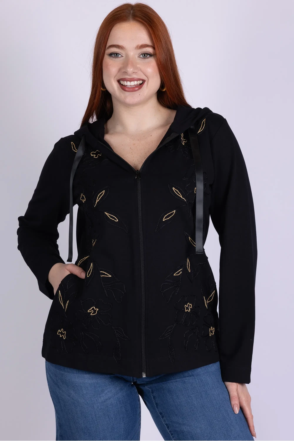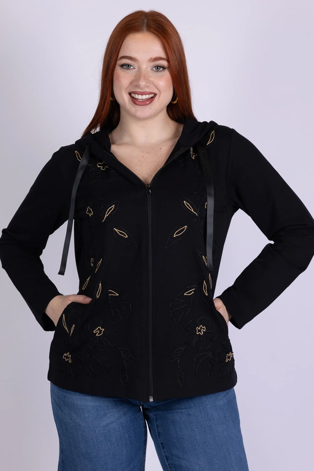 Dai carattere ai tuoi abbinamenti con questa felpa sgarzata ricamata, un capo dal gusto casual arricchito da dettagli originali. Il modello presenta chiusura frontale con zip e cappuccio, elementi pratici che la rendono perfetta per lâuso quotidiano.