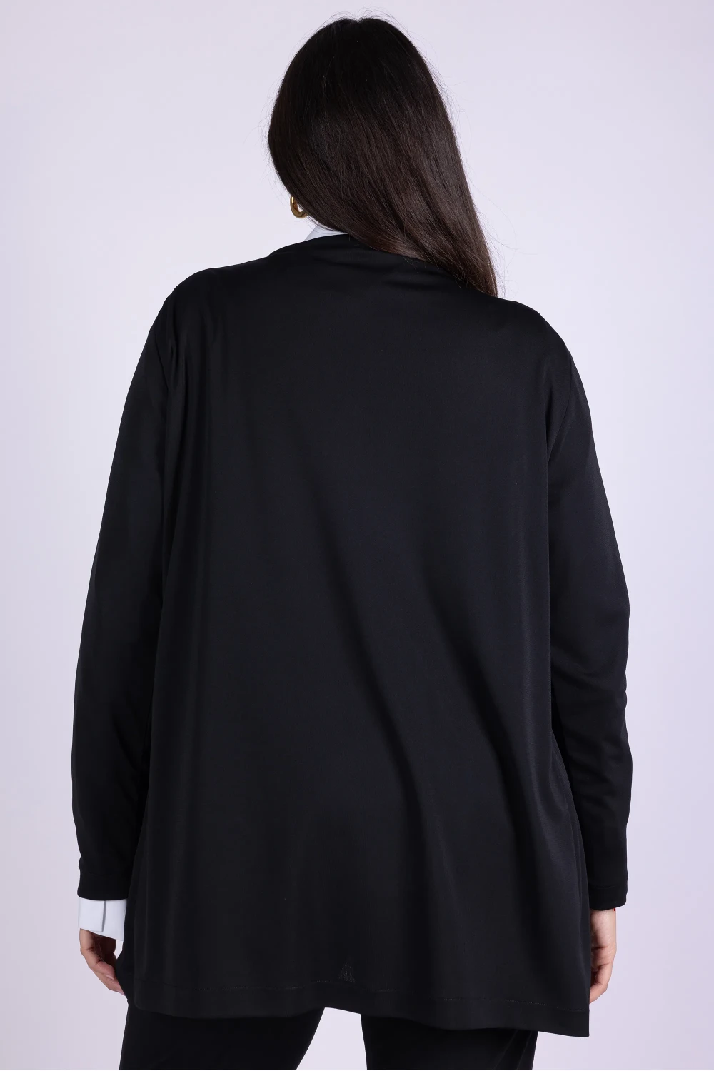 Spolverino curvy modello sciallato realizzato in tessuto elasticizzato, caratterizzato da una linea morbida che cade con naturalezza sul corpo.