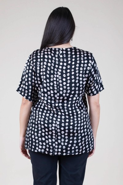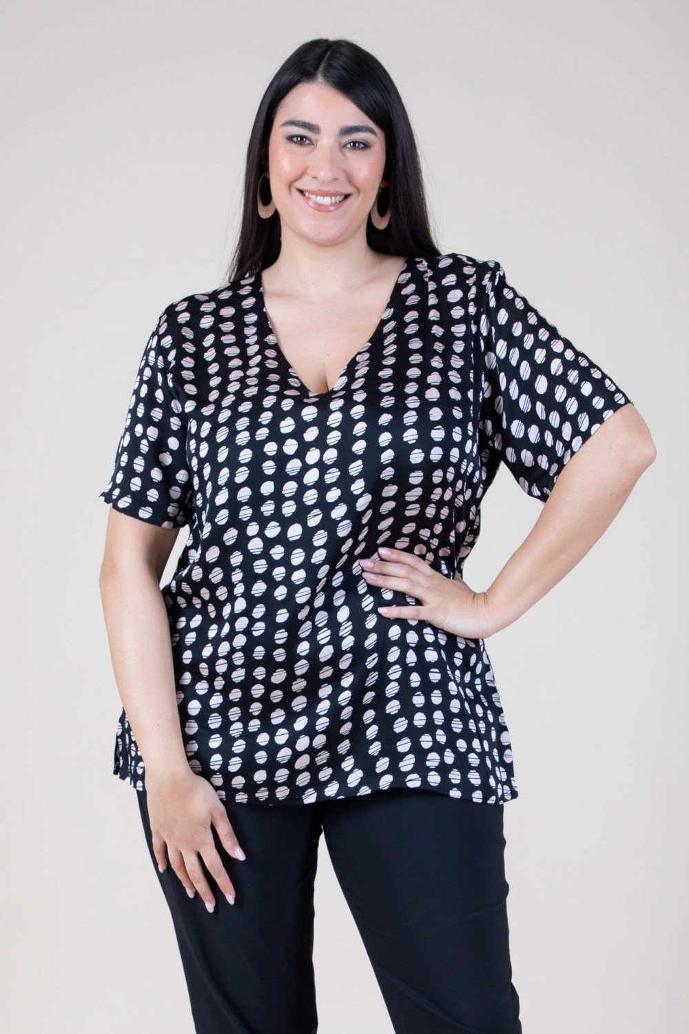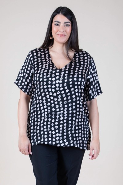 Scopri la raffinatezza di questa casacca curvy in misto seta stampata, pensata per esaltare la tua femminilità con eleganza e comfort. Lo scollo a V slancia la figura e dona un tocco di sensualità discreta, mentre la mezza manica rende il capo perfetto per la mezza stagione o per un look versatile tutto lanno.Il tessuto in misto seta regala una sensazione di leggerezza e morbidezza sulla pelle, arricchito da una stampa vivace che dona personalità e colore al tuo outfit. Ideale da indossare con pantaloni eleganti o jeans per un look curvy contemporaneo e sempre impeccabile.