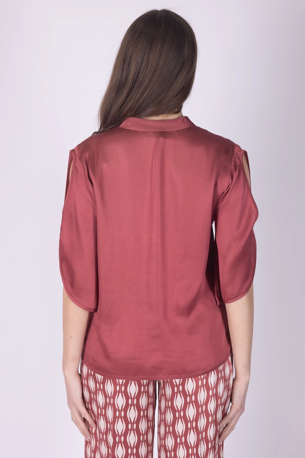 Questa casacca in misto seta con scollo a V e collo coreana, unisce dettagli originali e leggerezza. Il modello è arricchito da maniche 3/4 a bocciolo con oblò, particolari che donano carattere e movimento al design.
