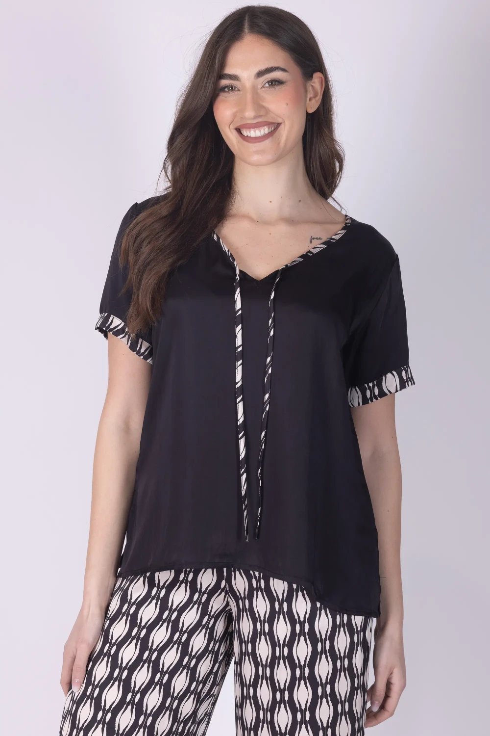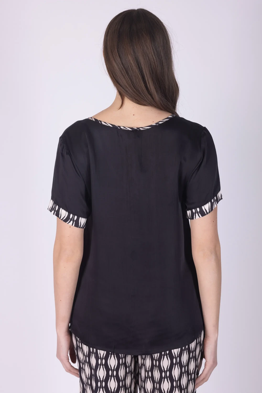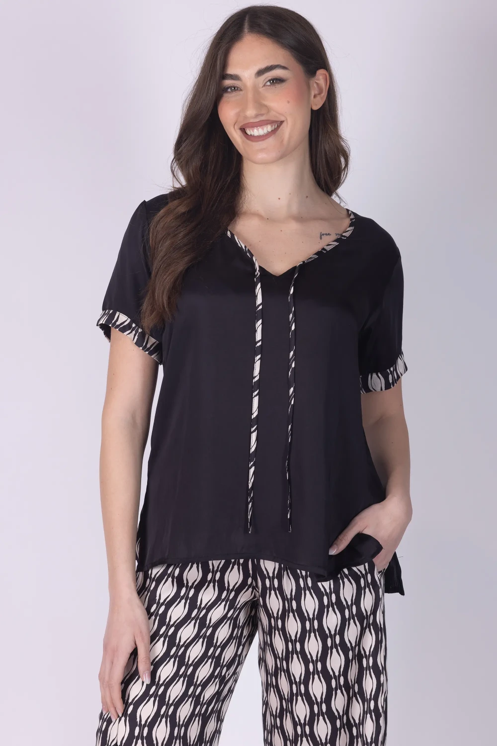Casacca in misto seta a mezza manica con scollo a V, arricchita da dettagli fantasia che donano al capo un elemento decorativo e vivace.