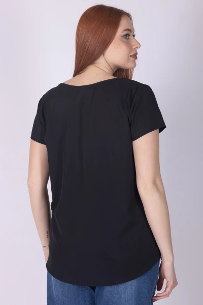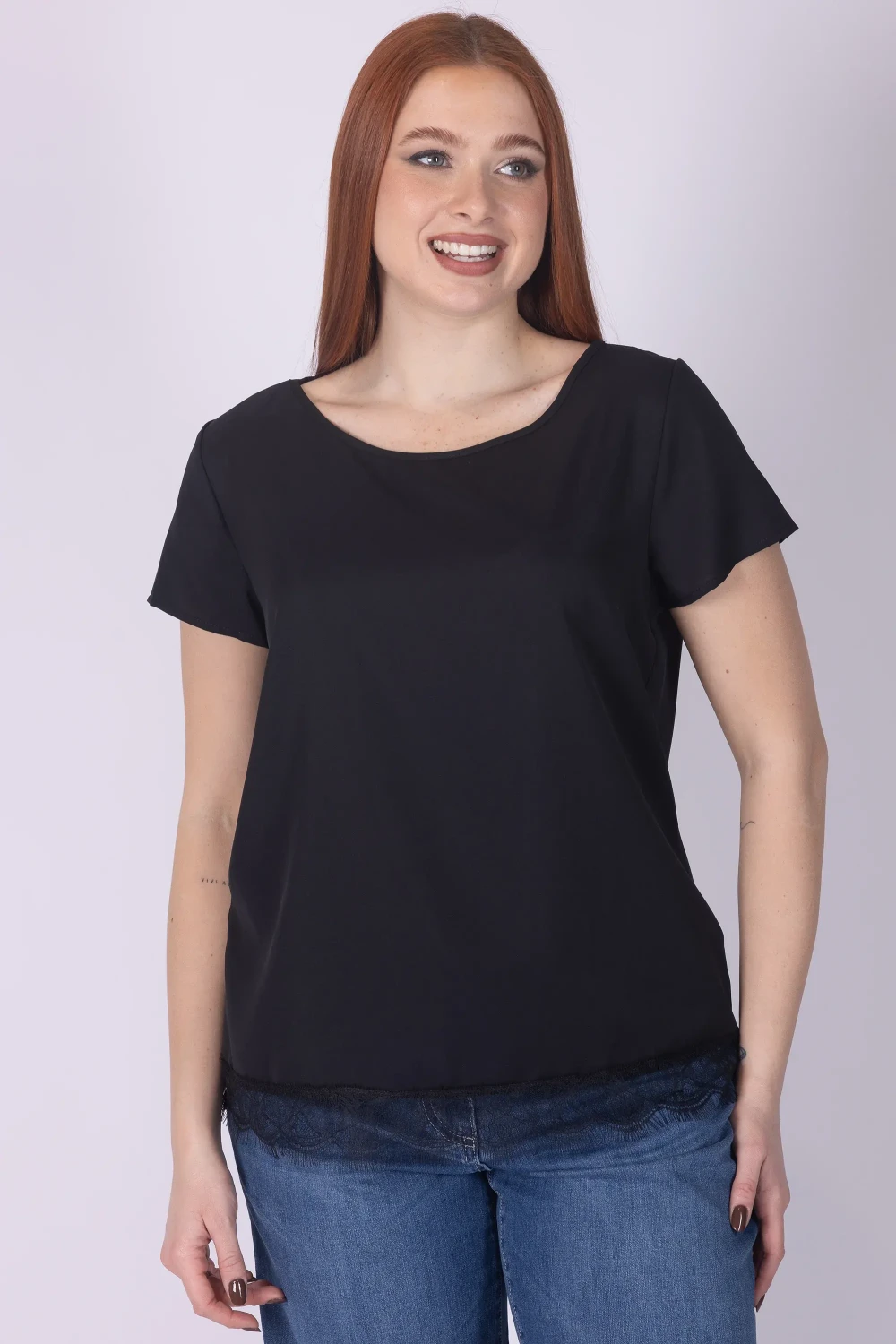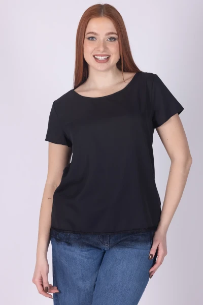 Aggiungi un tocco delicato ai tuoi abbinamenti con questa casacca girocollo a mezza manica, un capo femminile e versatile pensato per essere indossato con facilità. Il design è valorizzato dal pizzo applicato sul fondo, dettaglio raffinato che dona movimento e arricchisce la linea.