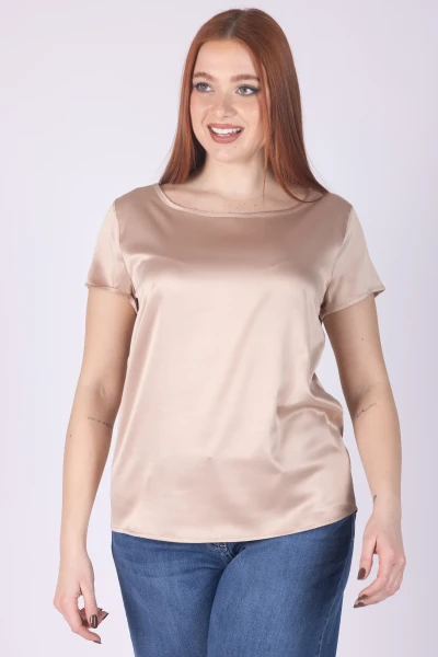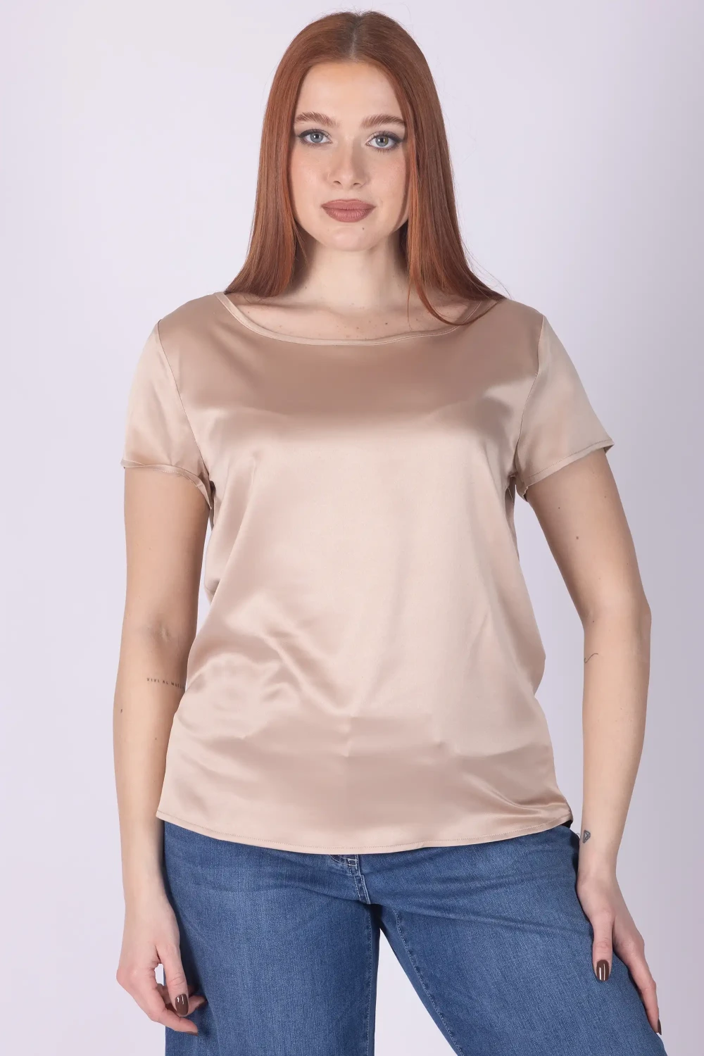 Aggiungi un tocco raffinato ai tuoi abbinamenti con questa casacca in raso girocollo, un capo essenziale ma ricco di fascino. Il modello con mezza manica presenta una linea semplice e pulita che valorizza il design del capo.