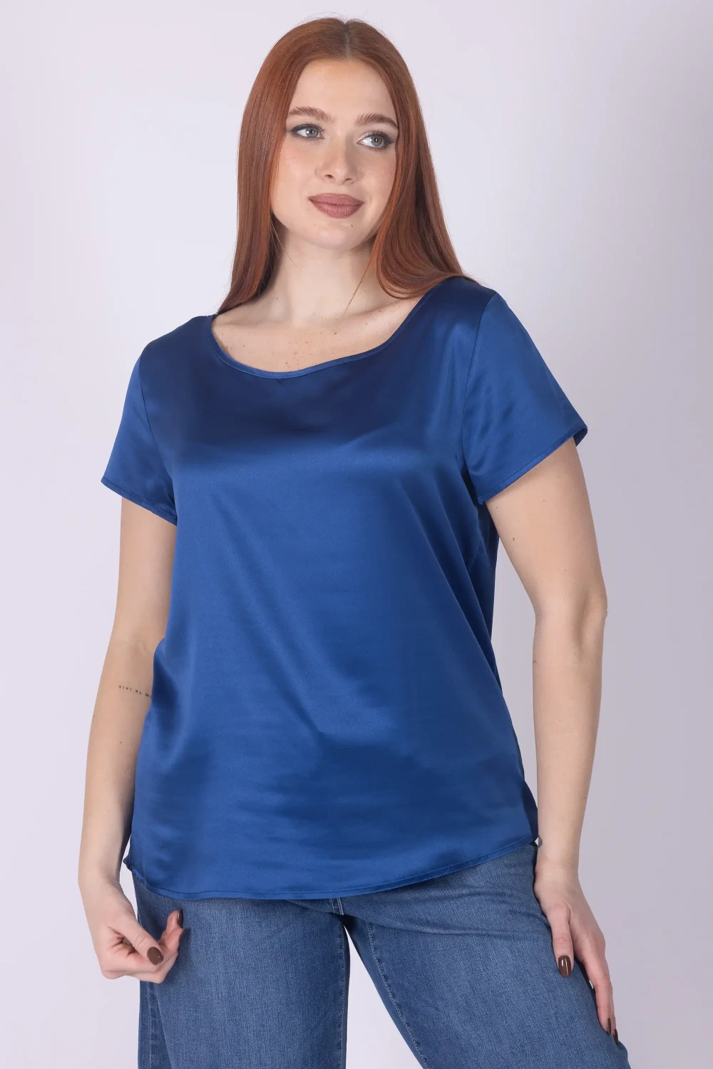 Aggiungi un tocco raffinato ai tuoi abbinamenti con questa casacca in raso girocollo, un capo essenziale ma ricco di fascino. Il modello con mezza manica presenta una linea semplice e pulita che valorizza il design del capo.