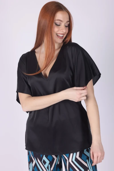 Rinnova il tuo stile con questa casacca in raso, un capo femminile e versatile pensato per dare carattere ai tuoi outfit. Il modello presenta scollo a V e mezza manica, dettagli che valorizzano la linea con semplicità.