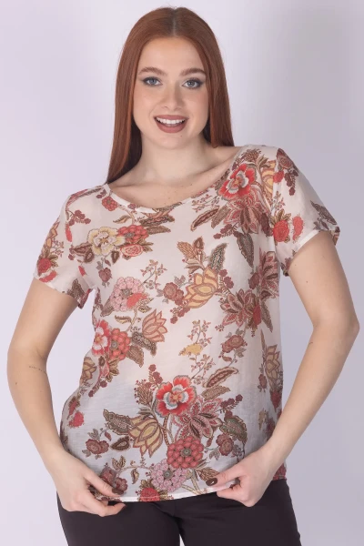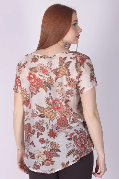 Casacca girocollo a mezza manica in tencel fantasia, caratterizzata da una stampa che dona al capo un aspetto fresco e dinamico.