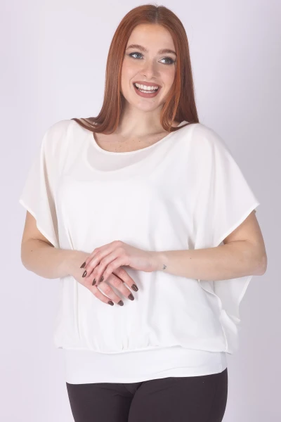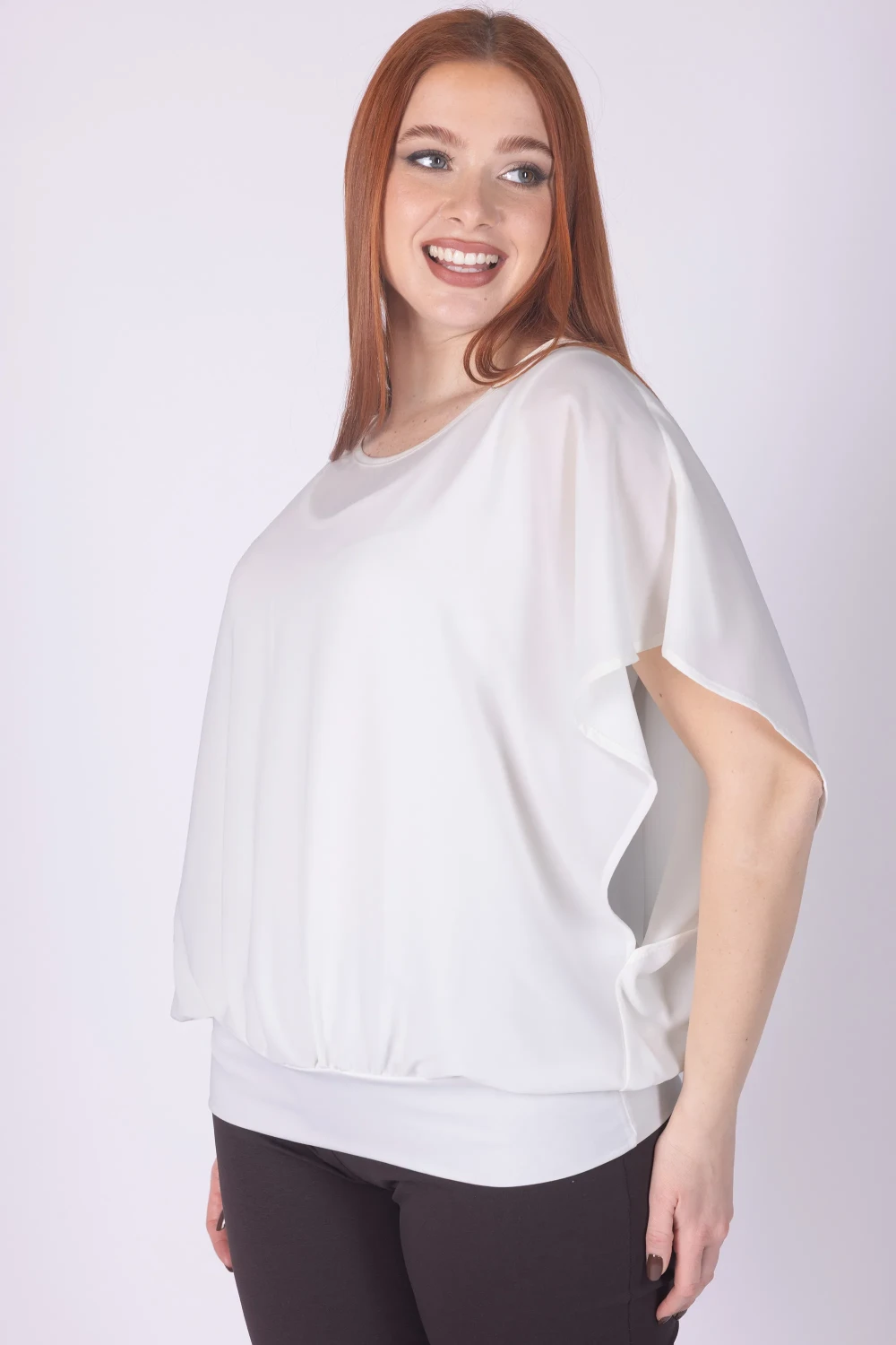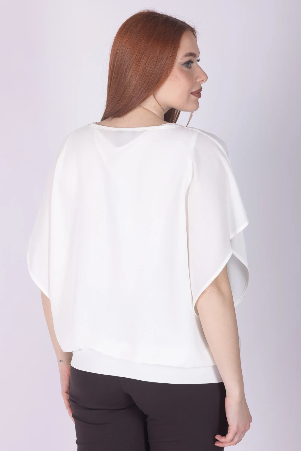 Casacca doppiata in viscosa con girocollo e manica ad aletta, caratterizzata da una linea morbida che cade con naturalezza sul corpo.