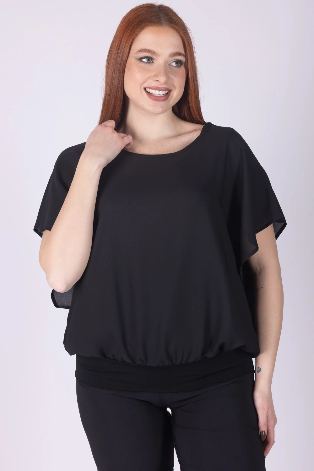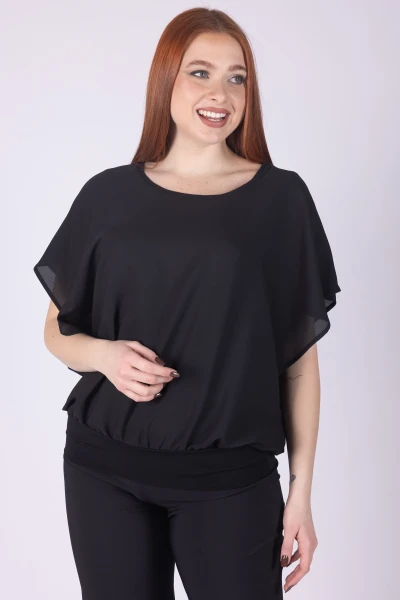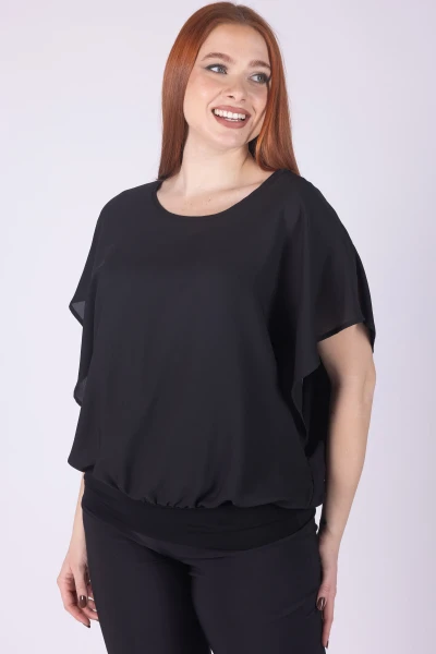 Casacca doppiata in viscosa con girocollo e manica ad aletta, caratterizzata da una linea morbida che cade con naturalezza sul corpo.