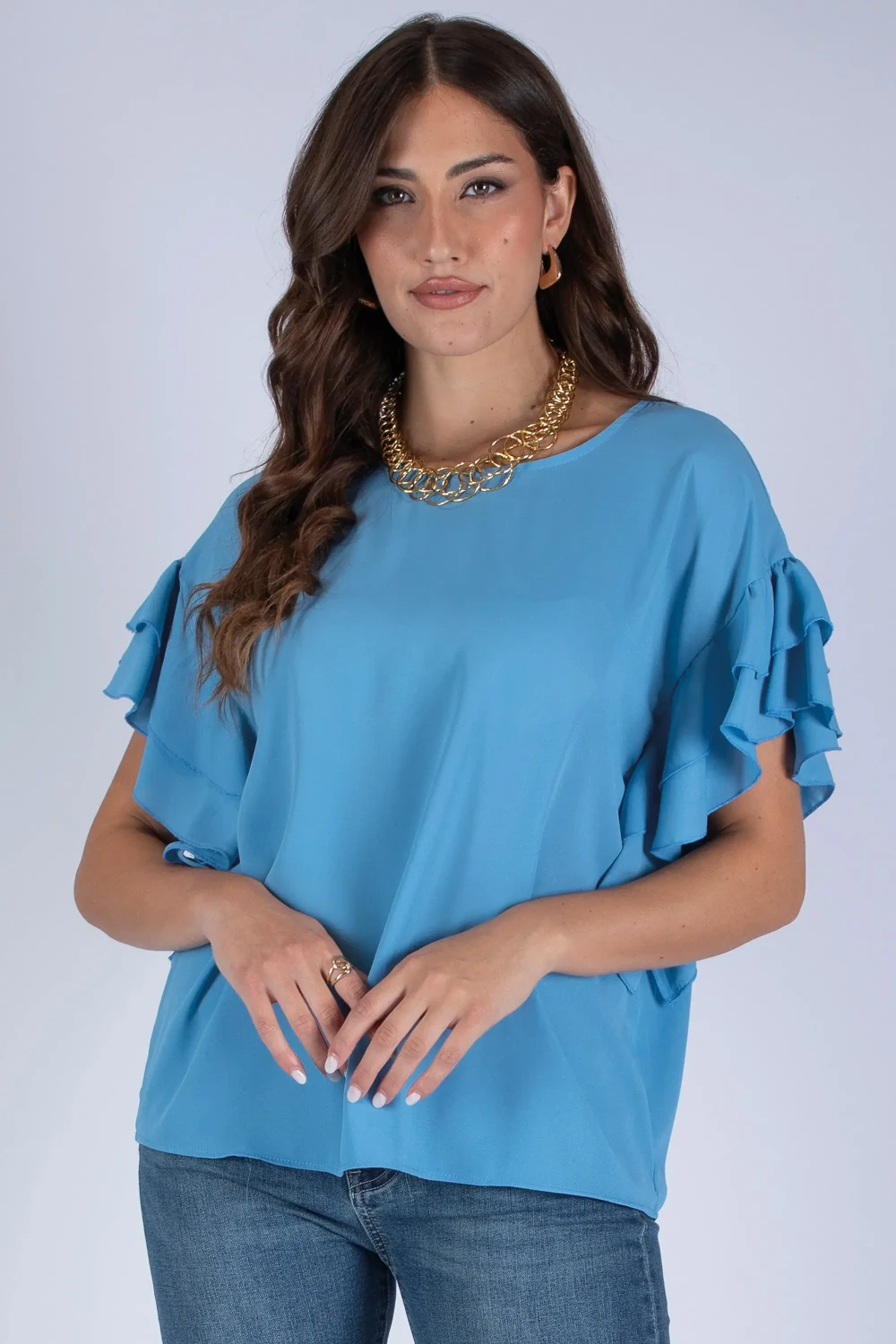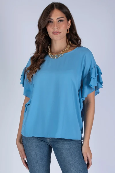 Casacca in georgette caratterizzata da maniche con rouches, dettaglio che dona movimento e un effetto delicato al design del capo.