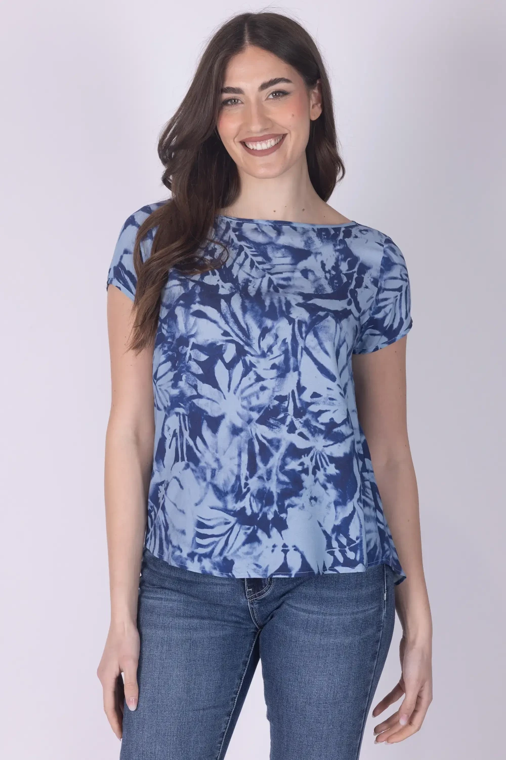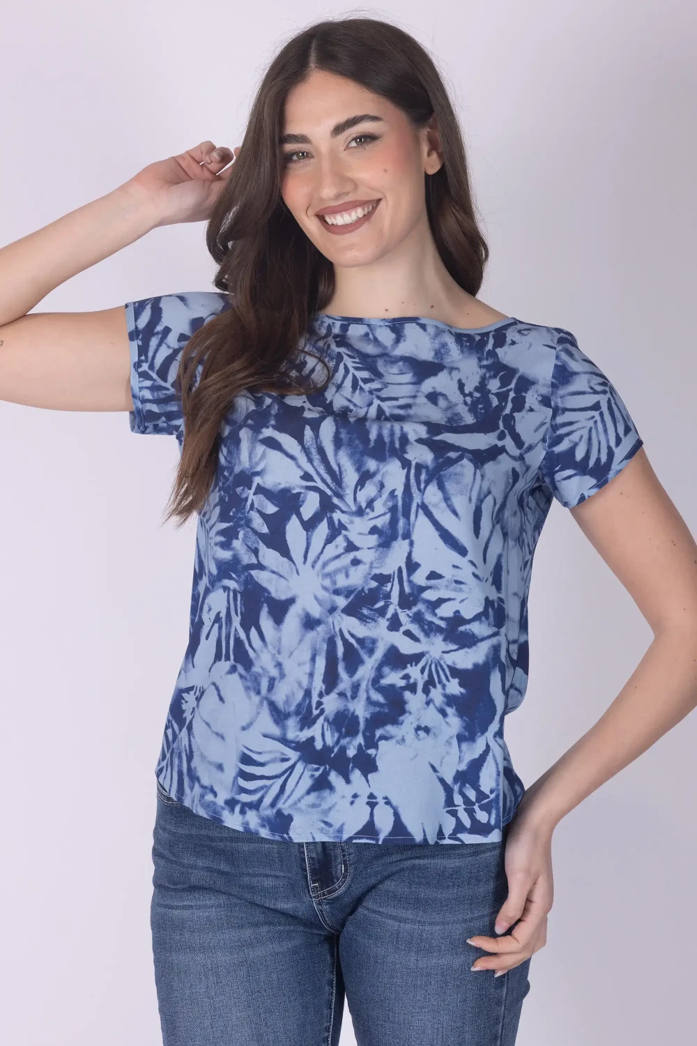 Dai vivacità ai tuoi abbinamenti con questa casacca donna in fantasia, un capo leggero e femminile pensato per accompagnare con stile le tue giornate. Il modello presenta girocollo e mezza manica, con una linea semplice che valorizza il design.