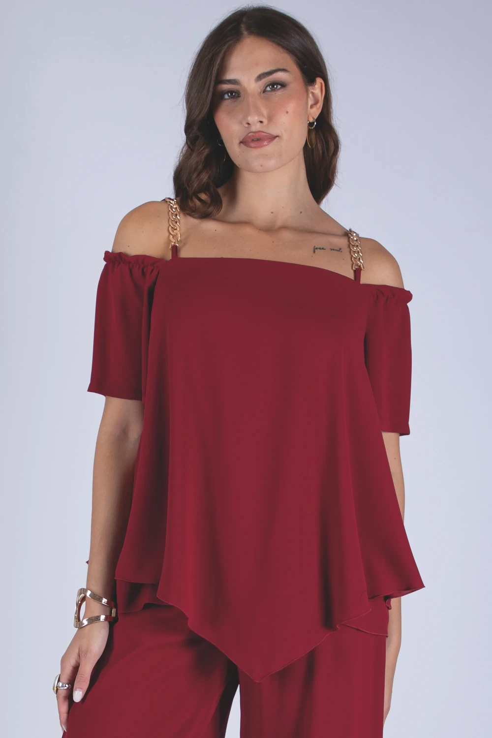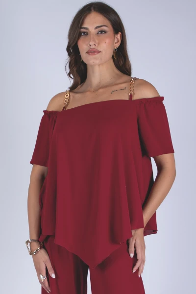 Casacca in georgette doppiata a mezza manica, caratterizzata da una linea morbida che valorizza la leggerezza del tessuto. Il modello è arricchito da spalline impreziosite da un dettaglio decorativo che dona al capo un elemento distintivo.