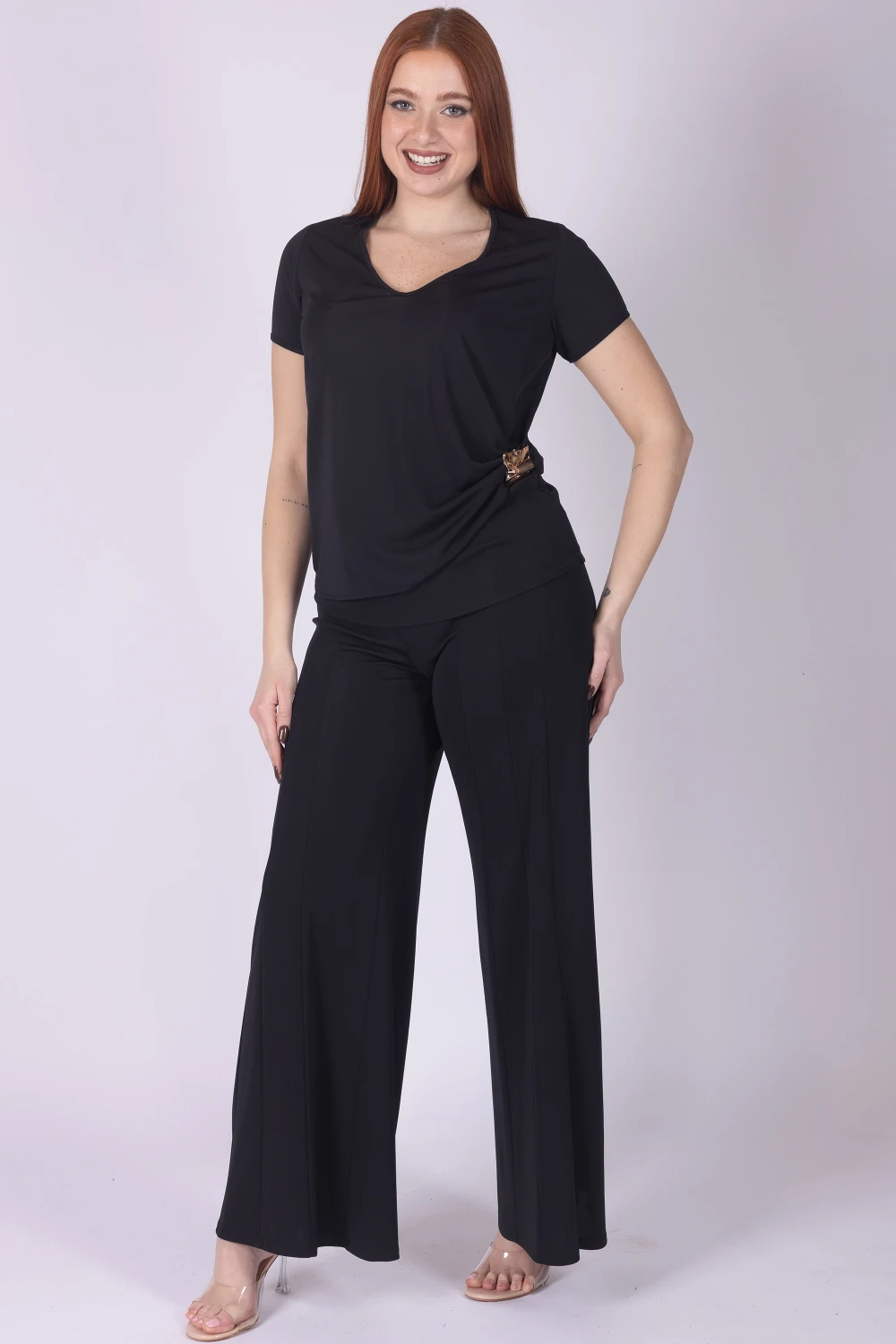 . Il design è completato da spilla con motivo gioiello, dettaglio luminoso che aggiunge un accento ricercato.
