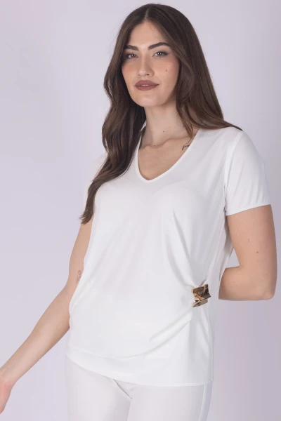 Casacca con scollo a V, caratterizzata da drappeggio sul fianco che crea un effetto morbido sulla linea del capo