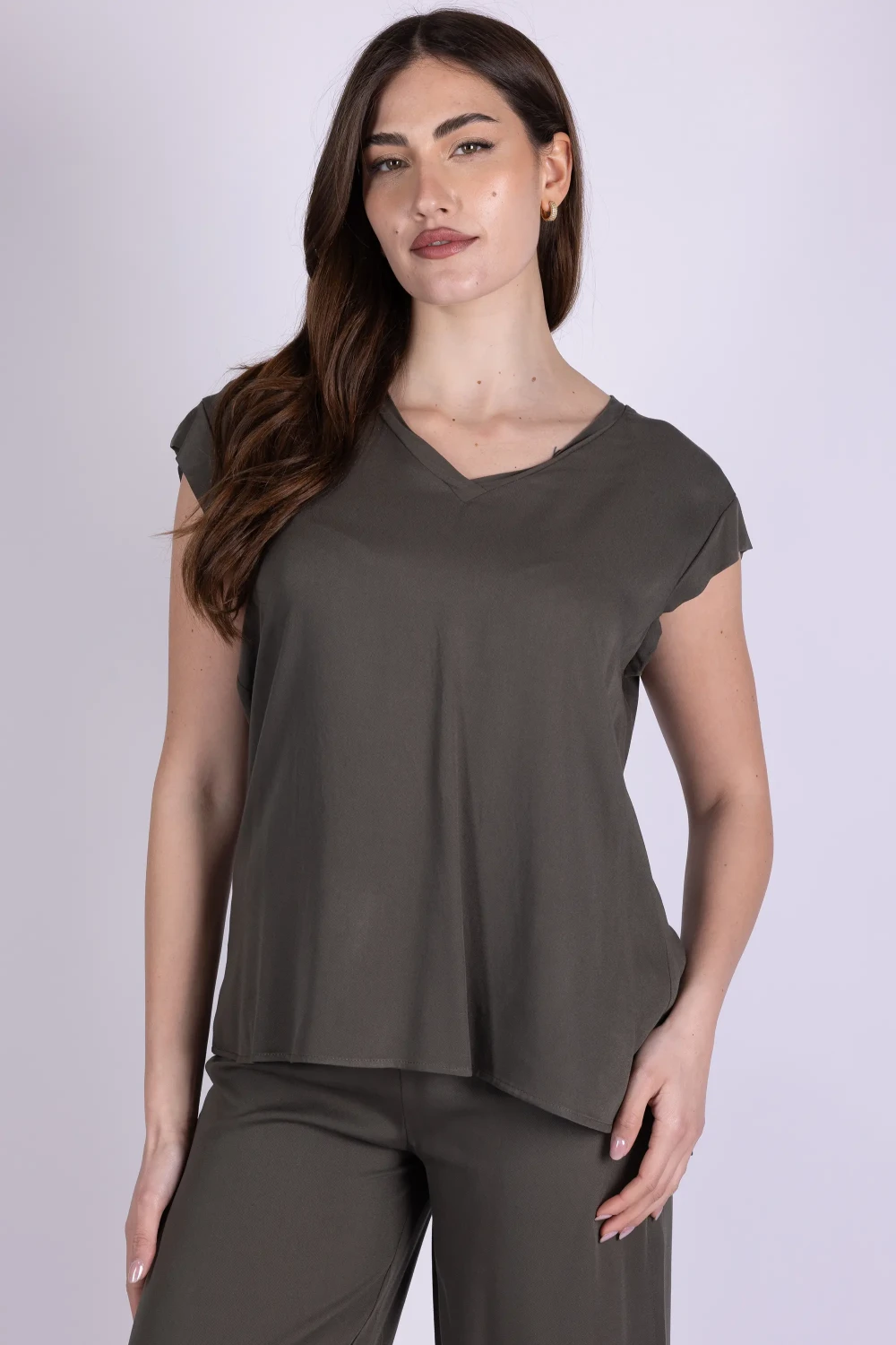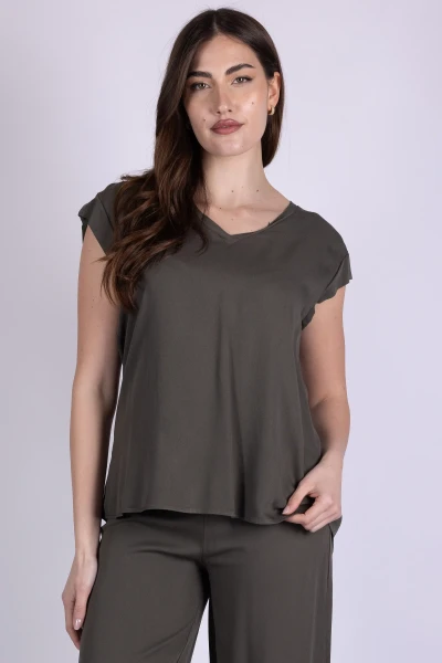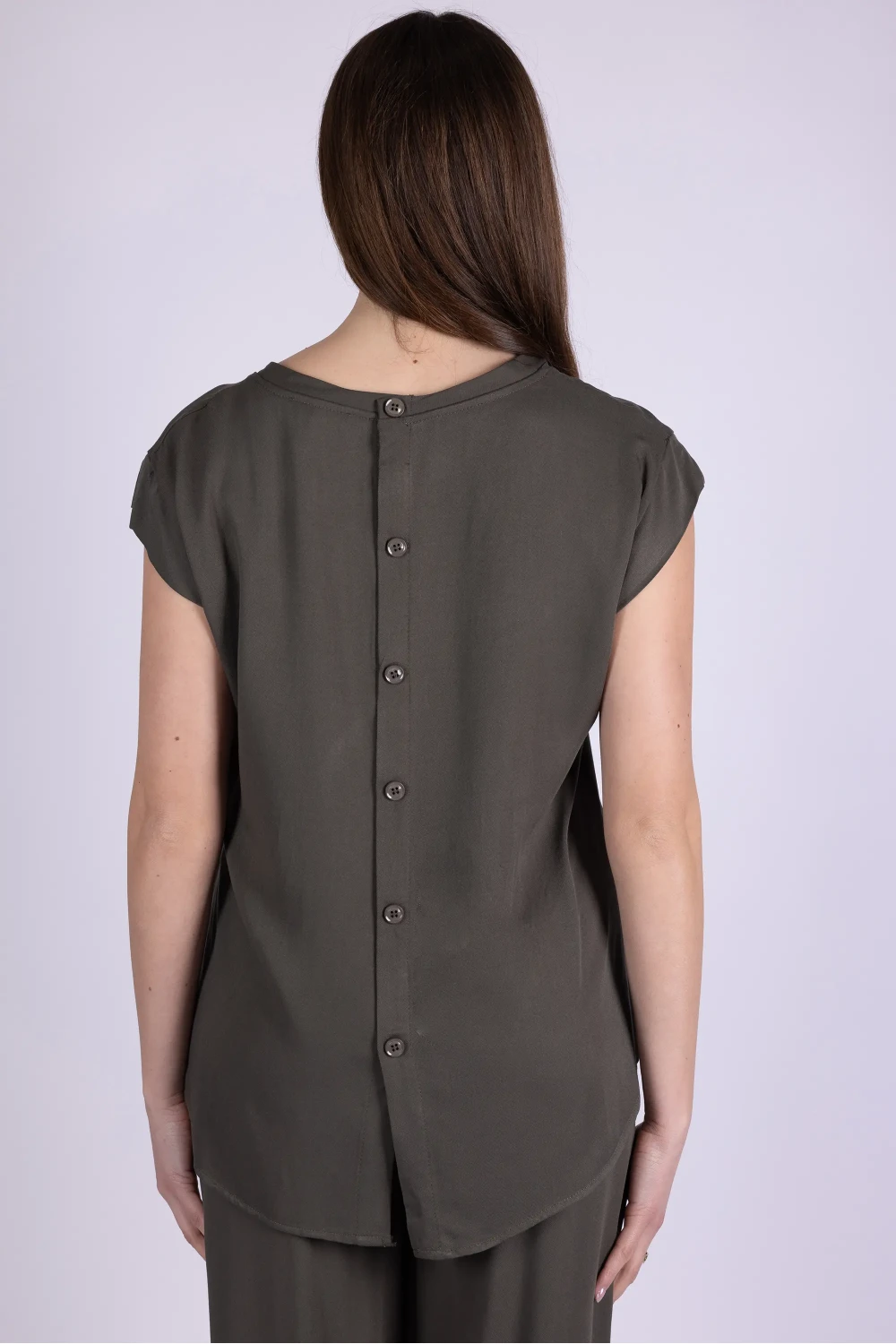 Casacca scollo a V con manica ad aletta, caratterizzata da una linea morbida che cade con naturalezza sul corpo. Il modello è impreziosito da bottoni sul retro centrale, dettaglio che aggiunge un elemento originale e curato al design.