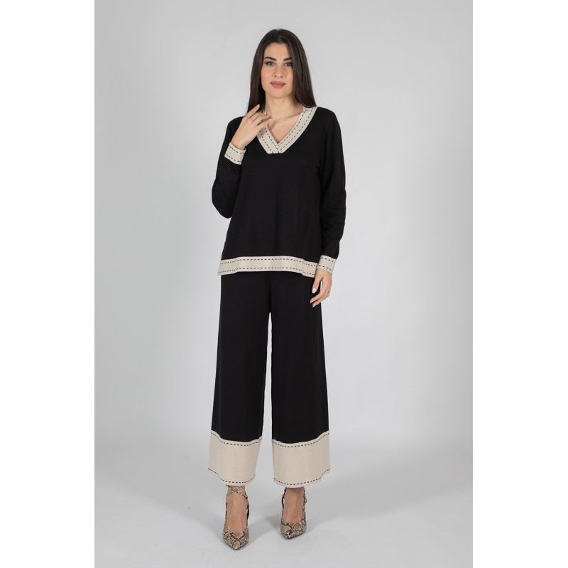 Un completo sofisticato pensato per chi cerca eleganza e originalità in un look coordinato. Composto da pantalone e maglia con scollo a V, è impreziosito da una balza a contrasto con lavorazione jacquard effetto impuntura, che dona carattere e movimento al capo. La morbida composizione in viscosa, lana ed elastan assicura comfort e vestibilità impeccabile. Perfetto per outfit versatili dal gusto raffinato, da indossare con stile in ogni occasione. 70% viscosa 20% lana 10% elastan