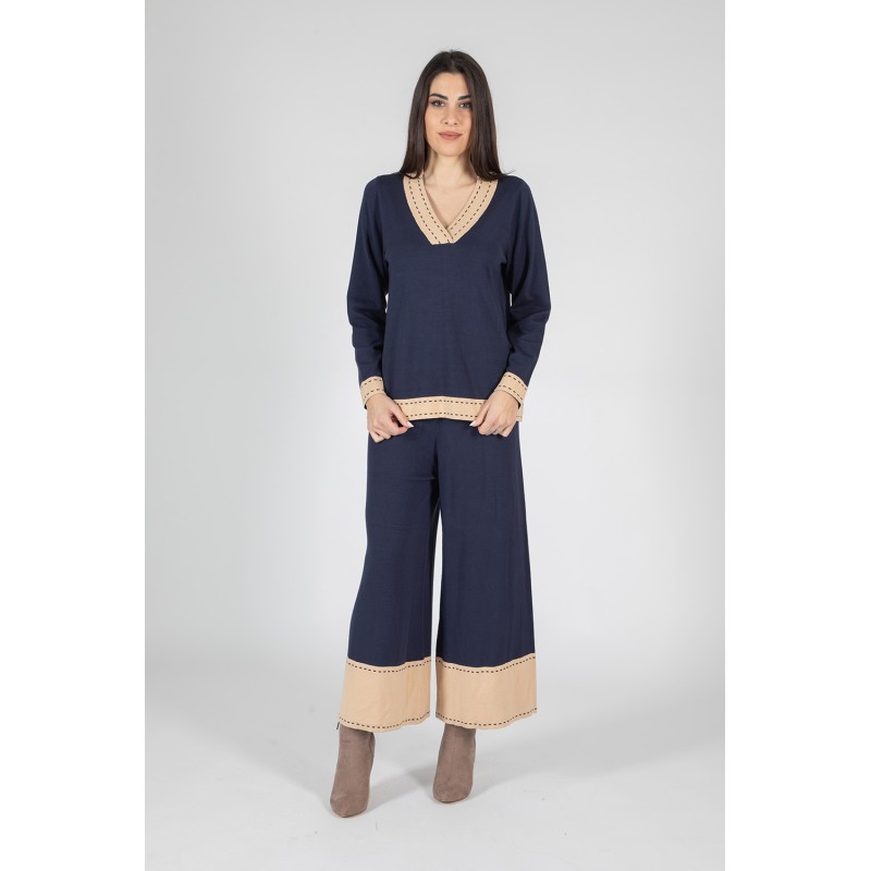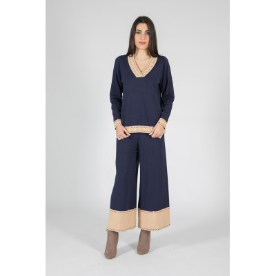 Un completo sofisticato pensato per chi cerca eleganza e originalità in un look coordinato. Composto da pantalone e maglia con scollo a V, è impreziosito da una balza a contrasto con lavorazione jacquard effetto impuntura, che dona carattere e movimento al capo. La morbida composizione in viscosa, lana ed elastan assicura comfort e vestibilità impeccabile. Perfetto per outfit versatili dal gusto raffinato, da indossare con stile in ogni occasione. 70% viscosa 20% lana 10% elastan