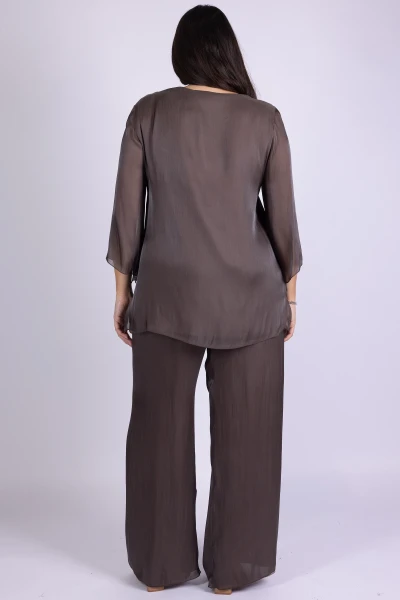 Scegli uno stile curato e armonioso con questo completo curvy elegante, composto da casacca girocollo con manica tre quarti e pantalone con elastico in vita. Un coordinato pensato per valorizzare le forme con comfort e sicurezza.