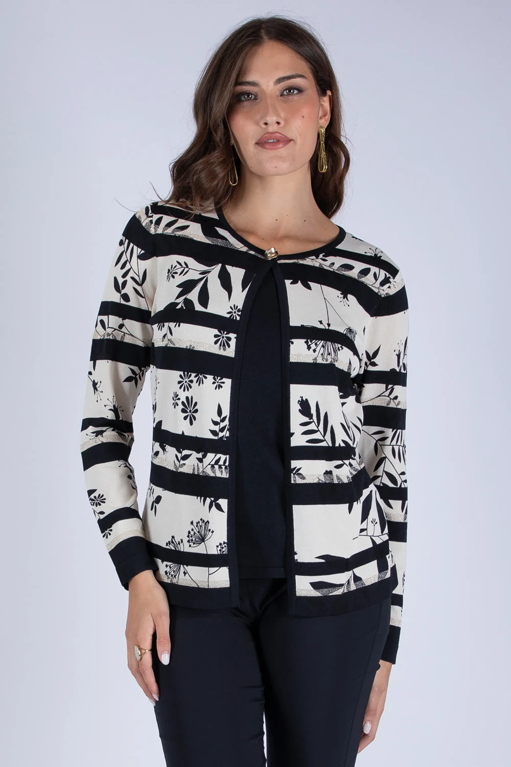 Un capo dal design ricercato che richiama lâeleganza del twin set in una versione pratica. Il modello presenta una fantasia floreale arricchita da giochi di righe con filo lurex, dettagli luminosi che creano movimento e donano un raffinato effetto brillante.