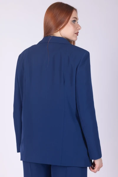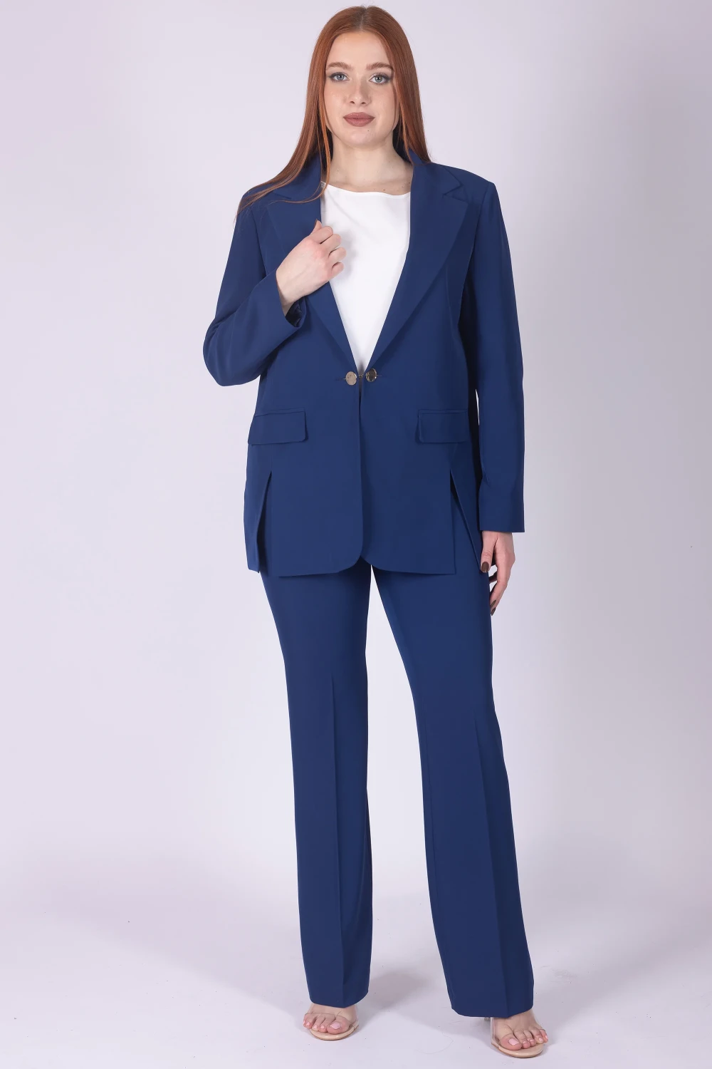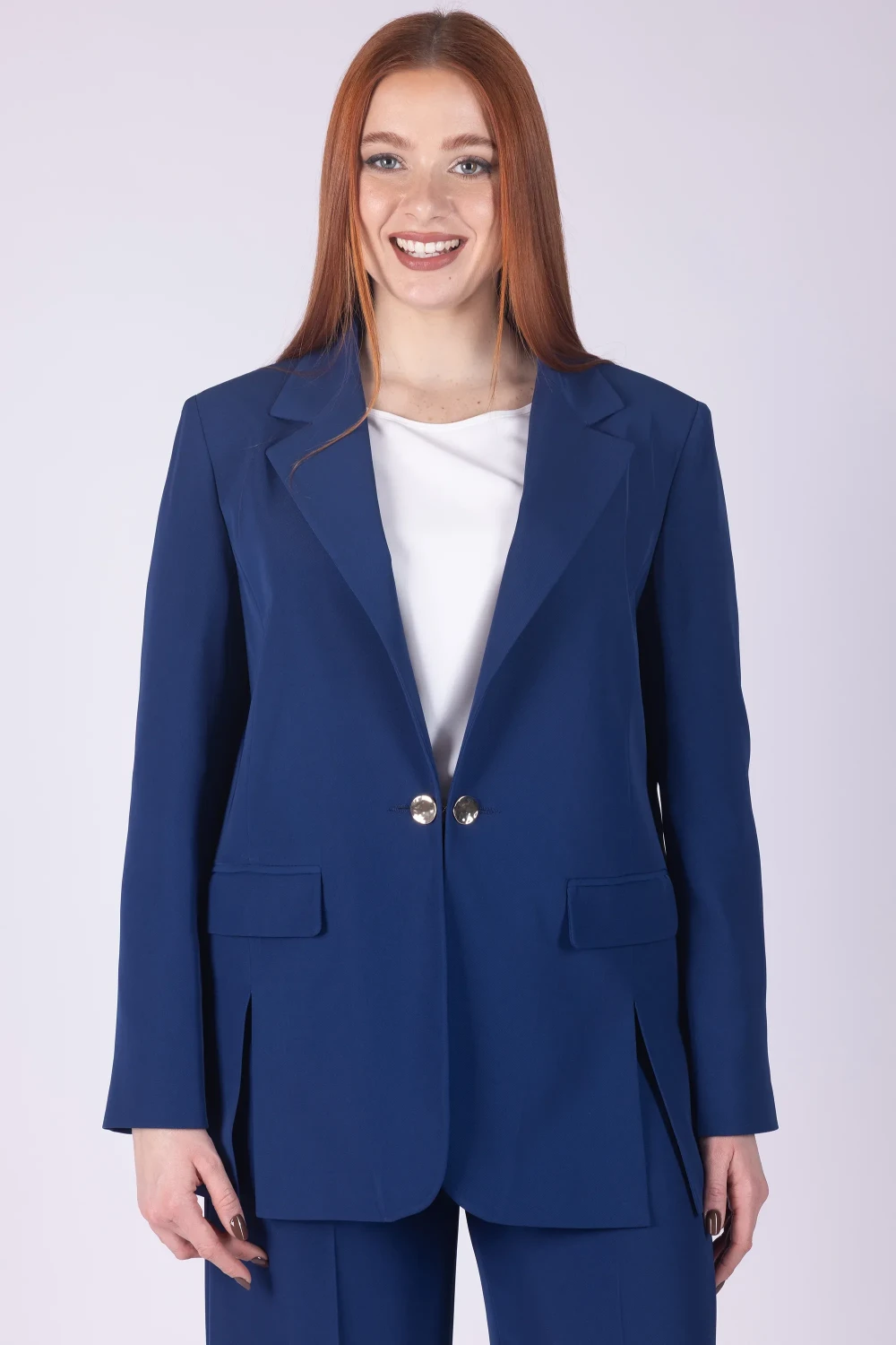 Gli spacchi frontali donano movimento alla linea della giacca e valorizzano la vestibilità, mentre il tessuto leggermente elasticizzato assicura comfort e una caduta fluida.