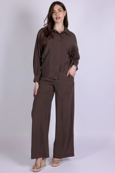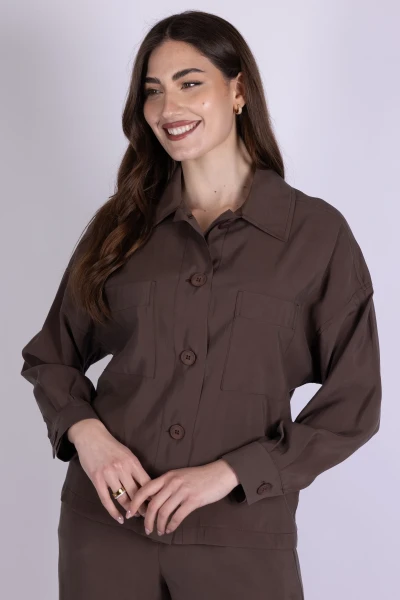Giacca stile camicia caratterizzata da tasconi frontali che aggiungono funzionalità e carattere al design del capo. Il modello è completato da bottoni effetto legno, dettaglio che dona un accento naturale e originale.