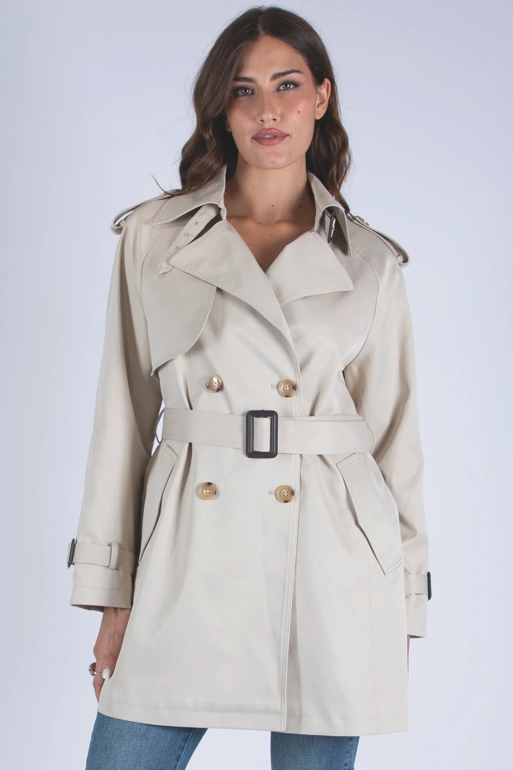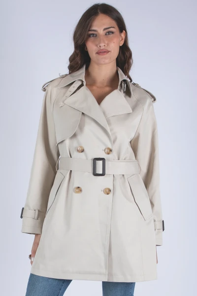 Trench in viscosa caratterizzato da pattina sulle spalle, dettaglio che richiama lo stile classico del capo. Il modello presenta tasche a friso frontali e bottoni effetto tartaruga, particolari che valorizzano il design con un accento ricercato.